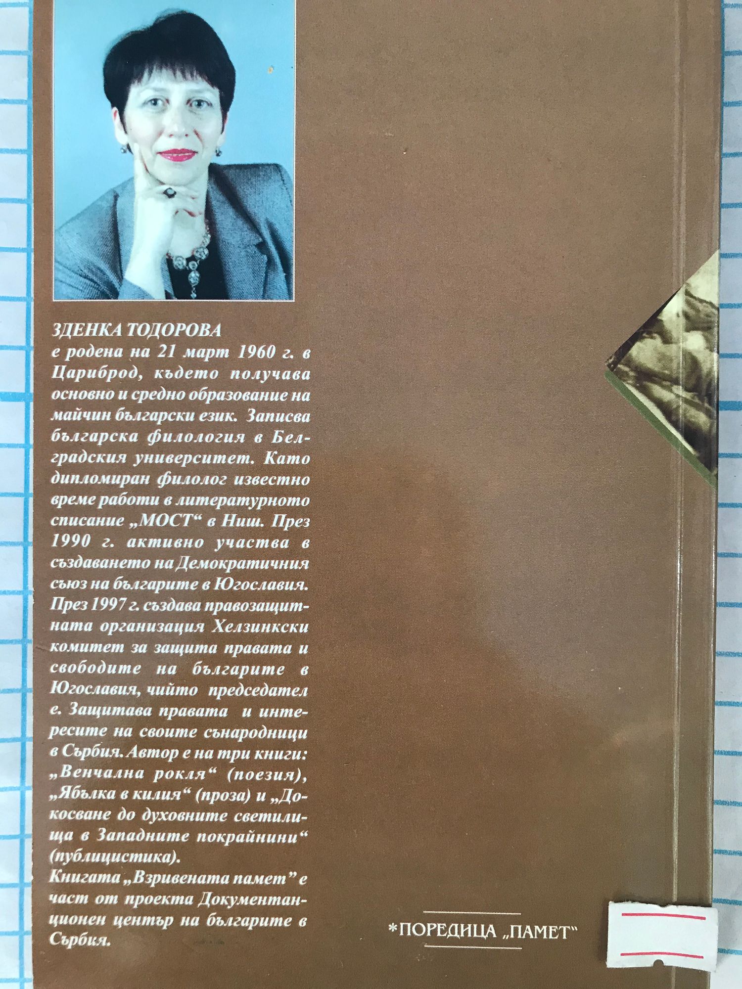 Авторката е родена на 21 март 1960 г. в Цариброд, където получава основно и средно образование на майчин български език. Записва българска филология в Белградския университет. Като дипломиран филолог известно време работи в литературното списание „МОСТ“ в Ниш. През 1990 г. активно участва в създаването на Демократичния съюз на българите в Югославия. През 1997 г. създава правозащитната организация Хелзинкски комитет за защита правата и свободите на българите в Югославия, чийто председател e. Защитава правата и интересите на своите сънародници в Сърбия. Автор е на три книги: „Венчална рокля“ (поезия), „Ябълка в килия“ (проза) и „Докосване до духовните светилища в Западните покрайнини“ (публицистика). Книгата „Взривената памет” е част от проекта Документанционен център на българите в Сърбия.