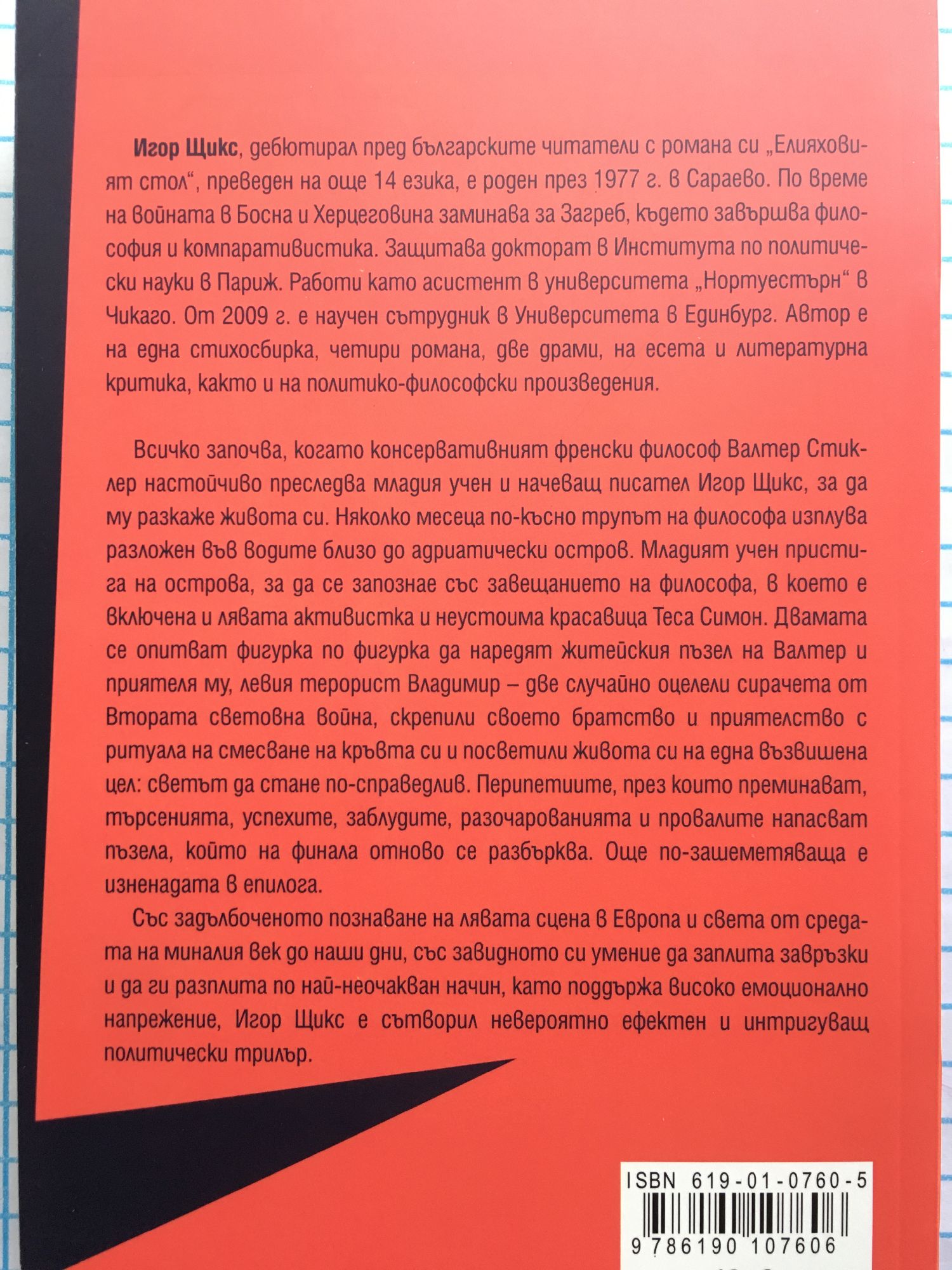Всичко започва, когато консервативният френски философ Валтер Стиклер настойчиво преследва младия учен и начеващ писател Игор Щикс, за да му разкаже живота си. Няколко месеца по-късно трупът на философа изплува разложен във водите близо до адриатически остров. Младият учен пристига на острова, за да се запознае със завещанието на философа, в което е включена и лявата активистка и неустоима красавица Теса Симон. Двамата се опитват фигурка по фигурка да наредят житейския пъзел на Валтер и приятеля му, левия терорист Владимир – две случайно оцелели сирачета от Втората световна война, скрепили своето братство и приятелство с ритуала на смесване на кръвта си и посветили живота си на една възвишена цел: светът да стане по-справедлив. Перипетиите, през които преминават, търсенията, успехите, заблудите, разочарованията и провалите напасват пъзела, който на финала отново се разбърква. Още по-зашеметяваща е изненадата в епилога. Със задълбоченото познаване на лявата сцена в Европа и света от средата на миналия век до наши дни, със завидното си умение да заплита завръзки и да ги разплита по най-неочакван начин, като поддържа високо емоционално напрежение, Игор Щикс е сътворил невероятно ефектен и интригуващ политически трилър.