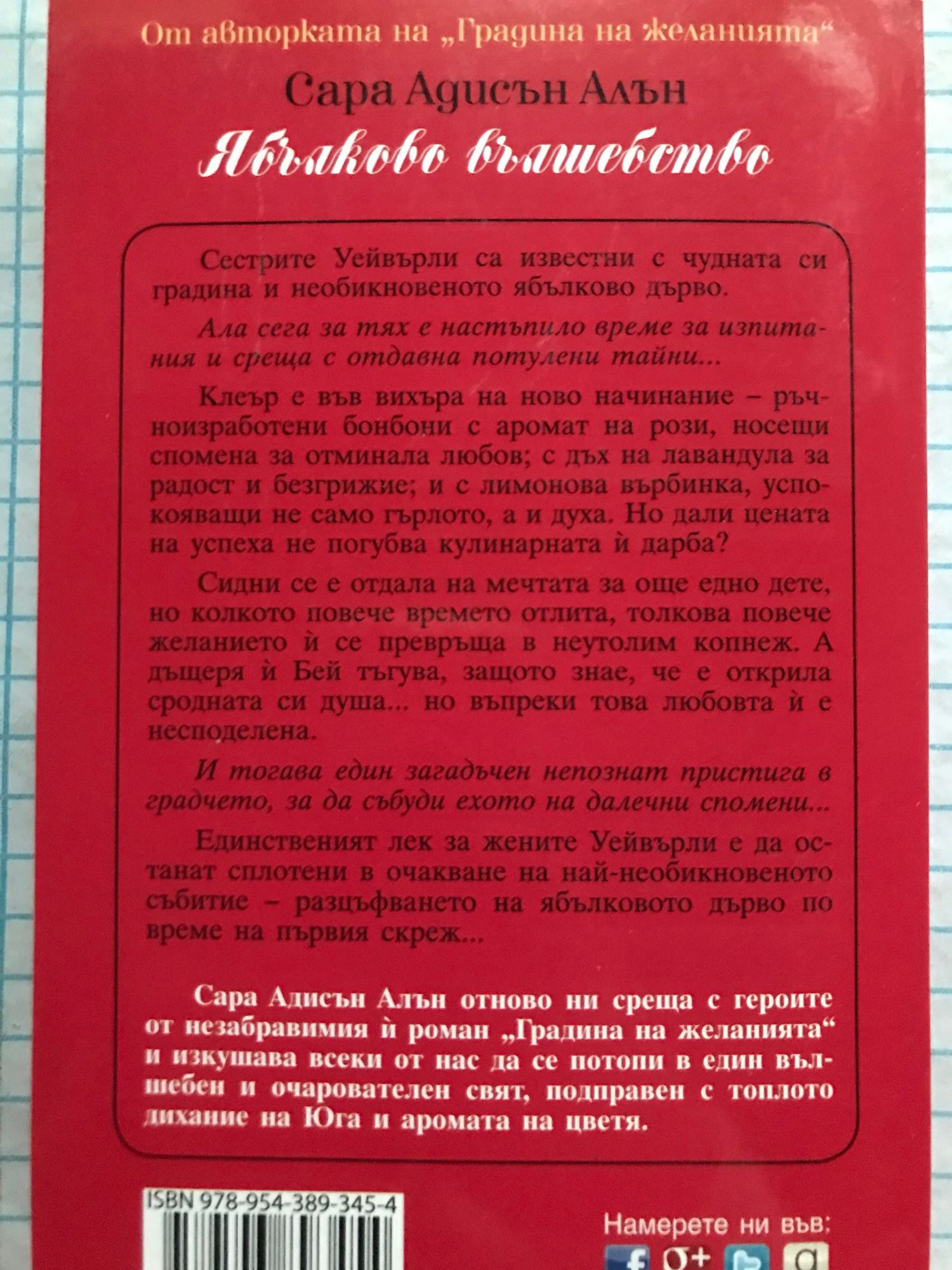 Сестрите Уейвърли са известни с чудната си градина и необикновеното ябълково дърво. Ала сега за тях е настъпило време за изпитания и среща с отдавна потулени тайни... Клеър е във вихъра на ново начинание – ръчноизработени бонбони с аромат на рози, носещи спомена за отминала любов; с дъх на лавандула за радост и безгрижие; и с лимонова върбинка, успокояващи не само гърлото, а и духа. Но дали цената на успеха не погубва кулинарната й дарба? Сидни се е отдала на мечтата за още едно дете, но колкото повече времето отлита, толкова повече желанието й се превръща в неутолим копнеж. А дъщеря й Бей тъгува, защото знае, че е открила сродната си душа... но въпреки това любовта й е несподелена. И тогава един загадъчен непознат пристига в градчето, за да събуди ехото на далечни спомени... Единственият лек за жените Уейвърли е да останат сплотени в очакване на най-необикновеното събитие – разцъфването на ябълковото дърво по време на първия скреж... Сара Адисън Алън отново ни среща с героите от незабравимия й роман „Градина на желанията“ и изкушава всеки от нас да се потопи в един вълшебен и очарователен свят, подправен с топлото дихание на Юга и аромата на цветя.