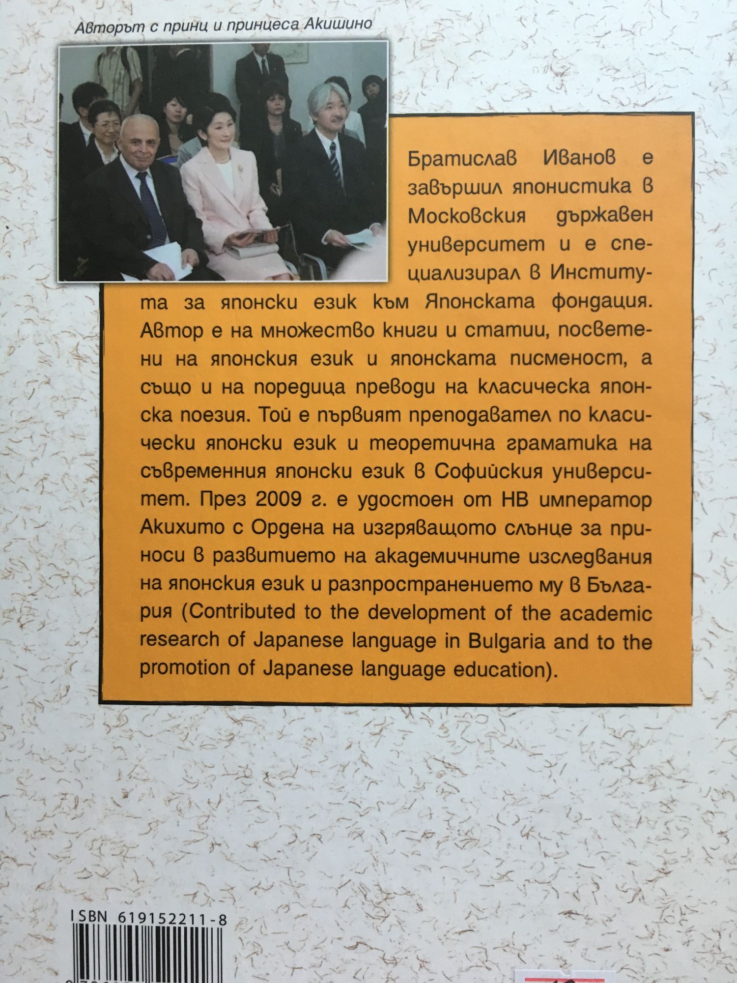 Братислав Иванов е завършил японистика в Московския държавен университет и е специализирал в Института за японски език към Японската фондация. Автор е на множество книги и статии, посветени на японския език и японската писменост, а също и на поредица преводи на класическа японска поезия. Той е първият преподавател по класически японски език в Софийския университет. През 2009 г. е удостоен от НВ император Акихито с Ордена на изгряващото слънце за приноси в развитието на академичните изследвания на японския език и разпространението му в България.
