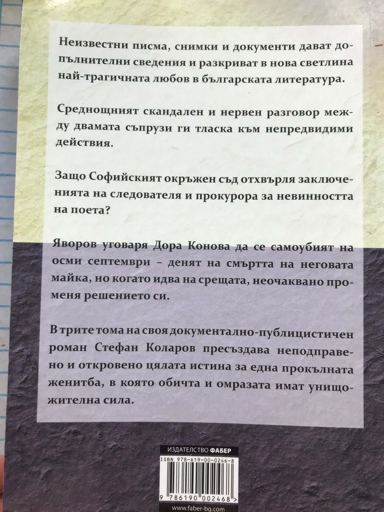 Неизвестни писма, снимки и документи дават допълнителни сведения и разкриват в нова светлина най-трагичната любов в българската литература. Среднощният скандален и нервен разговор между двамата съпрузи ги тласка към непредвидими действия. Защо Софийският окръжен съд отхвърля заключенията на следователя и прокурора за невинността на поета? Яворов уговаря Дора Конова да се самоубият на осми септември - денят на смъртта на неговата майка, но когато идва на срещата, неочаквано променя решението си. В трите тома на своя документално-публицистичен роман Стефан Коларов пресъздава неподправено и откровено цялата истина за една прокълната женитба, в която обичта и омразата имат унищожителна сила.