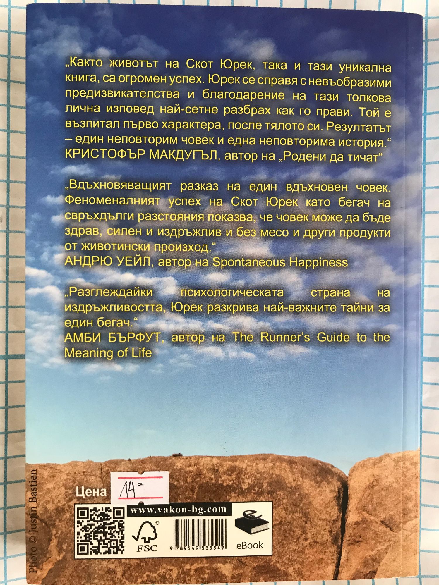 Както животът на Скот Юрек, така и тази уникална книга, са огромен успех. Юрек се справя с невъобразими предизвикателства и благодарение на тази толкова лична изповед, разбираме как го прави. Той е възпитал първо характера, после тялото си. Резултатът - един неповторим човек и една неповторима история. /Кристофър Макдугъл, автор на "Родени да тичат"/ Вдъхновяващият разказ на един вдъхновен човек. Феноменалният успех на Скот Юрек като бегач на свръхдълги разстояния показва, че човек може да бъде здрав, силен и издръжлив и без месо и други продукти от животински произход. /Андрю Уейл/ Разглеждайки психологическата страна на издръжливостта, Юрек разкрива най-важните тайни за един бегач. /Амби Бърфут/