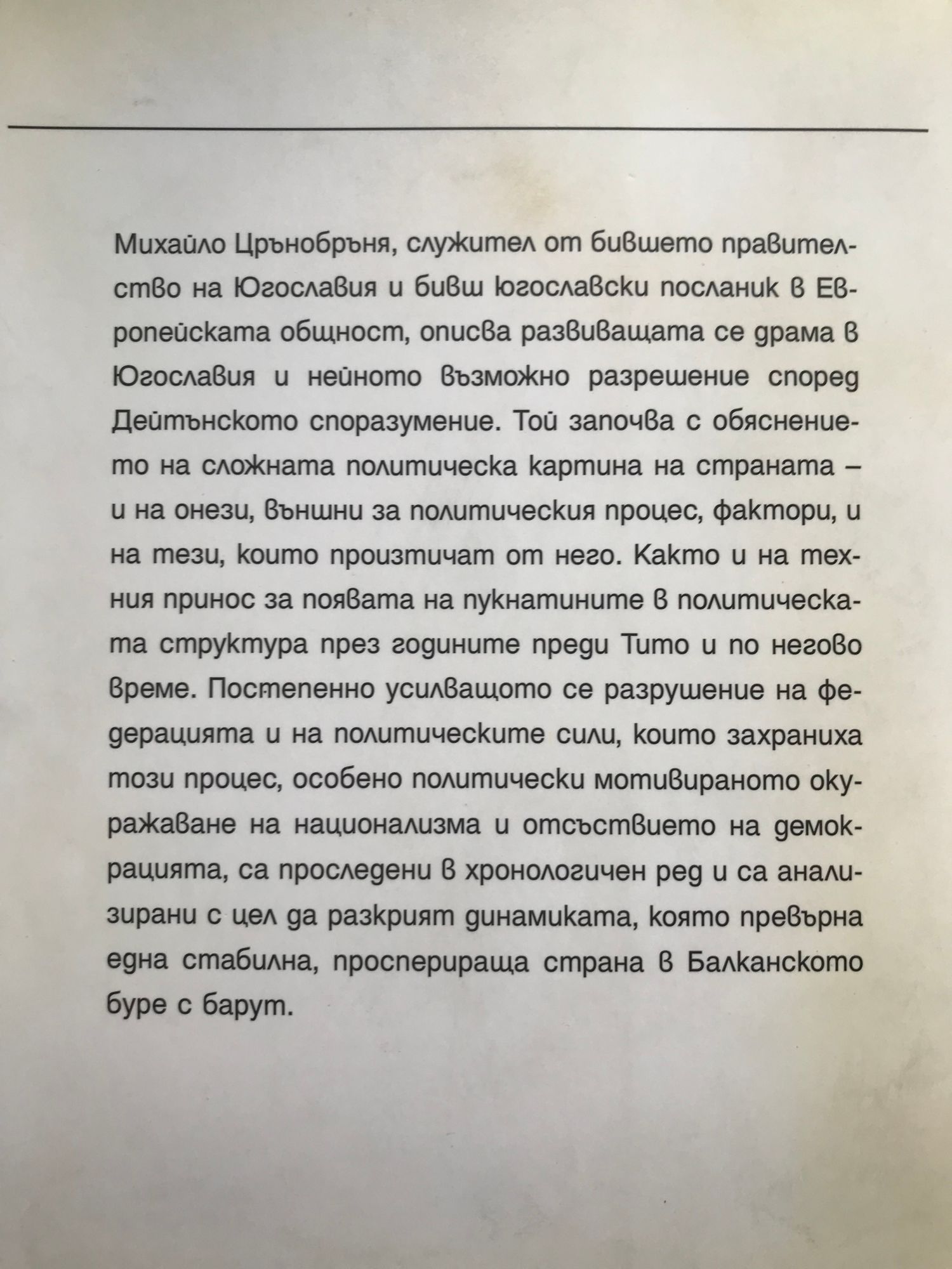 Михайло Црънобръня, служител от бившето правителство на Югославия и бивш югославски посланик в Европейската общност, описва развиващата се драма в Югославия и нейното възможно разрешение според Дейтънското споразумение. Той започва с обяснението на сложната политическа картина на страната -и на онези, външни за политическия процес, фактори, и на тези, които произтичат от него. Както и на техния принос за появата на пукнатините в политическата структура през годините преди Тито и по негово време. Постепенно усилващото се разрушение на федерацията и на политическите сили, които захраниха този процес, особено политически мотивираното окуражаване на национализма и отсъствието на демокрацията, са проследени в хронологичен ред и са анализирани с цел да разкрият динамиката, която превърна една стабилна, просперираща страна в Балканското буре с барут.
