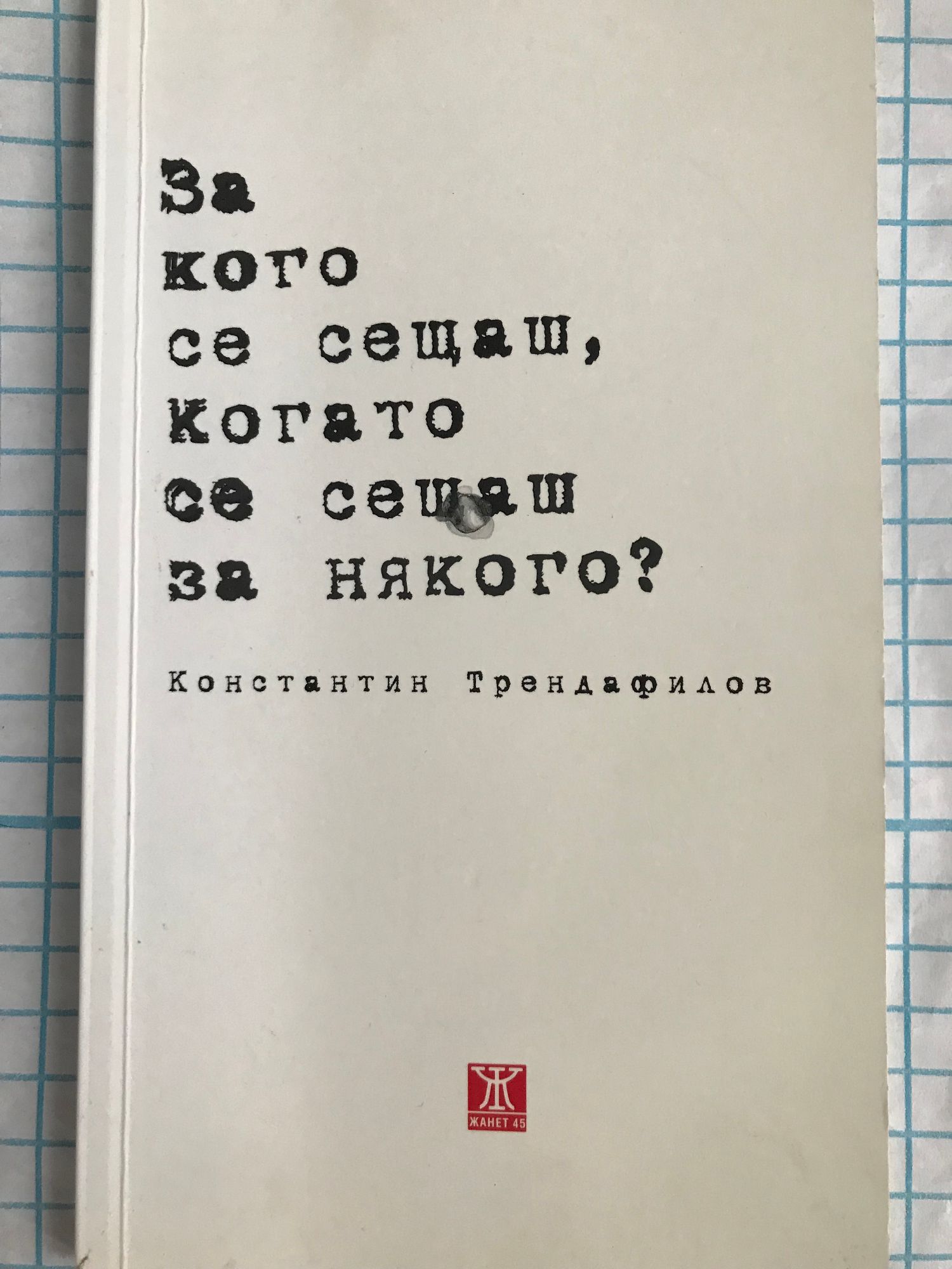 Чувам, че сме били последното свободно поколение на Земята. Дали е така, не зная, но зная друго – краят на света винаги се отлага от Поезията и от Поетите. Радвам се за тази прекрасна книга и за този така талантлив млад човек, Константин Трендафилов. Добре дошъл в невидимата Съпротива на стиховете, Поете! Недялко Славов За любовта, когато тя се връща към нормалната телесна температура. Без много-много прилагателни, но пък с предостатъчно тайни глаголи. Когато краят идва преди началото, с широк жест и тиха болка. Край Константин Трендафилов подскачат малките демончета на узряващите чувства – и в тази дебютна книга ние чуваме техните разговори. Марин Бодаков