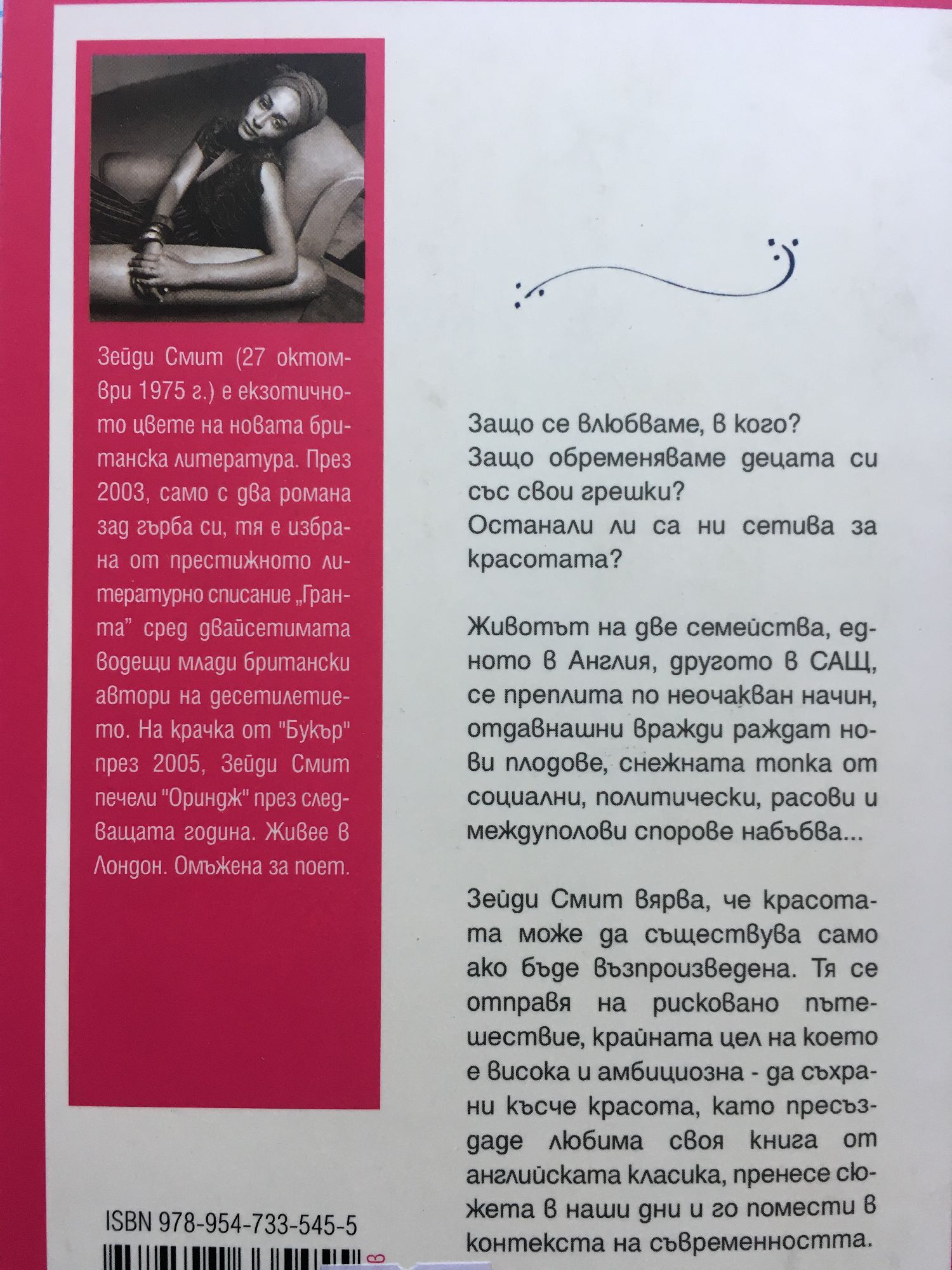 Зейди Смит е екзотична, загадъчна и успяла. Награждавана. И разминавала се с награди. Британка и не дотам. "За красотата" е богато угощение за сетивата. Роман върху роман. Очакван и познат, пореден и дебютен (на български език). Животът на две семейства, едното в Англия, другото в Америка, се преплита по странен начин, отколешни вражди раждат нови плодове, снежната топка от социални, политически, расови и междуполови спорове набъбва...