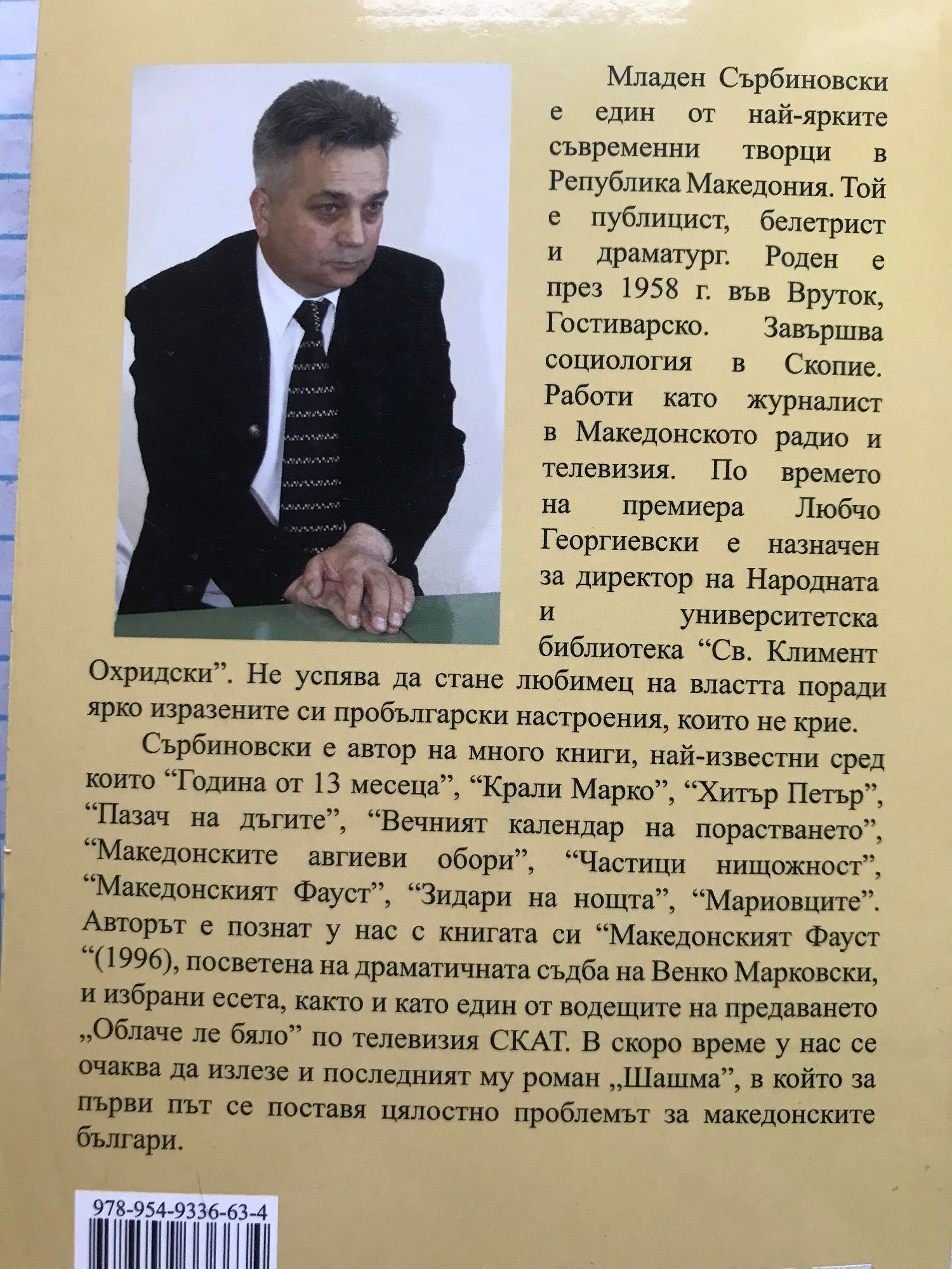 Младен Сърбиновски е един от най-ярките съвременни творци в Република Македония. Той е публицист, белетрист и драматург. Роден е през 1958 г. във Вруток, Гостиварско. Завършва социология в Скопие. Работи като журналист в Македонското радио и телевизия. По времето на премиера Любчо Георгиевски е назначен за директор на Народната и университетска библиотека "Св. Климент Охридски". Не успява да стане любимец на властта поради ярко изразените си пробългарски настроения, които не крие. Сърбиновски е автор на много книги, най-известни сред които "Година от 13 месеца", "Крали Марко", "Хитър Петър", "Пазач на дъгите", "Вечният календар на порастването", "Македонските авгиеви обори", "Частици нищожност", "Македонският Фауст", "Зидари на нощта", "Мариовците". Авторът е познат у нас с книгата си "Македонският Фауст "(1996), посветена на драматичната съдба на Венко Марковски, и избрани есета, както и като един от водещите на предаването „Облаче ле бяло" по телевизия СКАТ. В скоро време у нас се очаква да излезе и последният му роман „Шашма", в който за първи път се поставя цялостно проблемът за македонските българи.