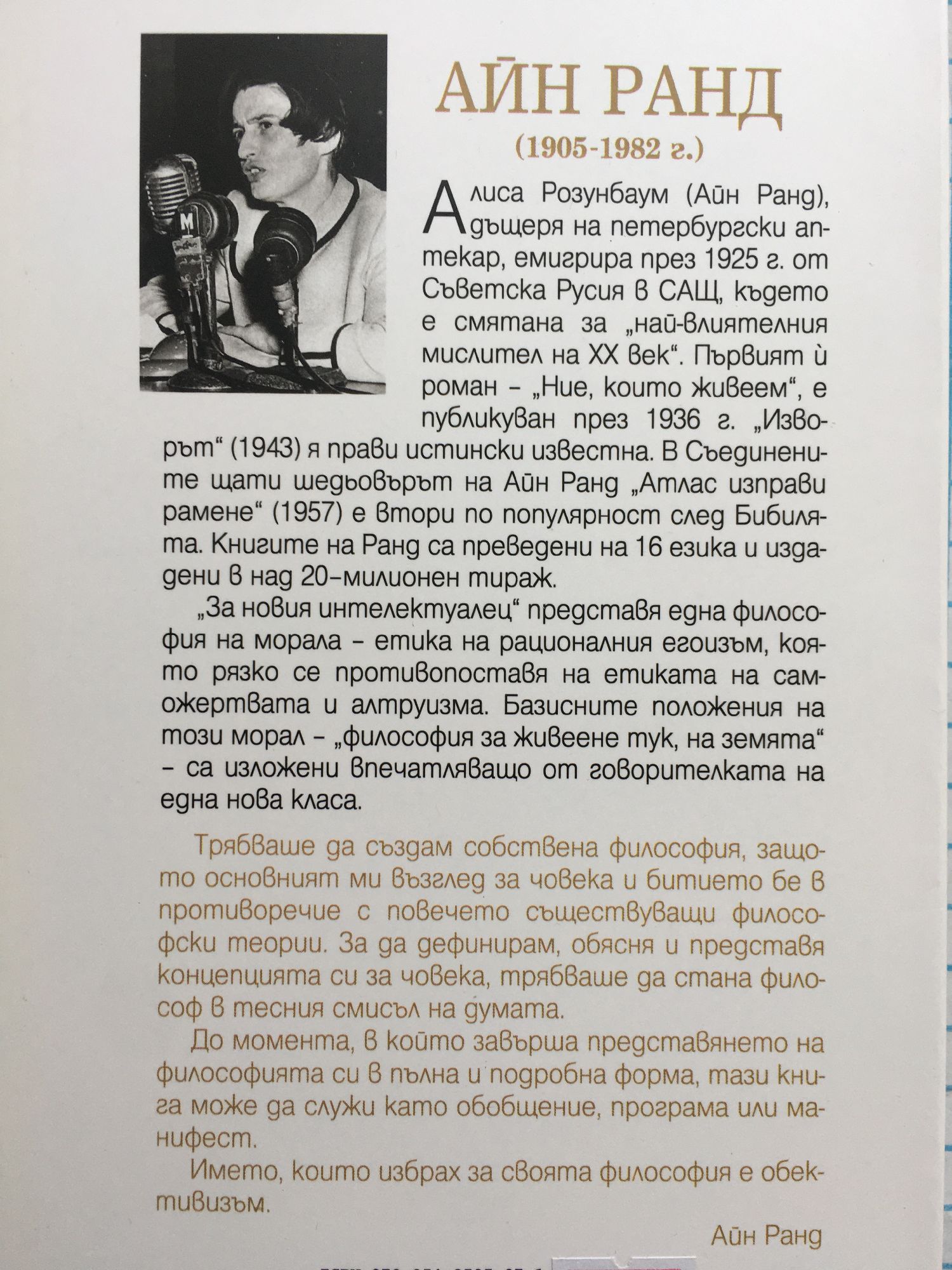 Алиса Розунбаум (Айн Ранд), дъщеря на петербургски аптекар, емигрира през 1925 г. от Съветска Русия в САЩ, където е смятана за „най-влиятелния мислител на XX век". Първият й роман - „Ние, които живеем", е публикуван през 1936 г. „Изворът" (1943) я прави истински известна. В Съединените щати шедьовърът на Айн Ранд „Атлас изправи рамене" (1957) е втори по популярност след Библията. Книгите на Ранд са преведени на 16 езика и издадени в над 20-милионен тираж. „За новия интелектуалец" представя една философия на морала - етика на рационалния егоизъм, която рязко се противопоставя на етиката на саможертвата и алтруизма. Базисните положения на този морал - „философия за живеене тук, на земята" - са изложени впечатляващо от говорителката на една нова класа. Трябваше да създам собствена философия, защото основният ми възглед за човека и битието бе в противоречие с повечето съществуващи философски теории. За да дефинирам, обясня и представя концепцията си за човека, трябваше да стана философ в тесния смисъл на думата. До момента, в който завърша представянето на философията си в пълна и подробна форма, тази книга може да служи като обобщение, програма или манифест. Името, което избрах за своята философия е обективизъм. Айн Ранд