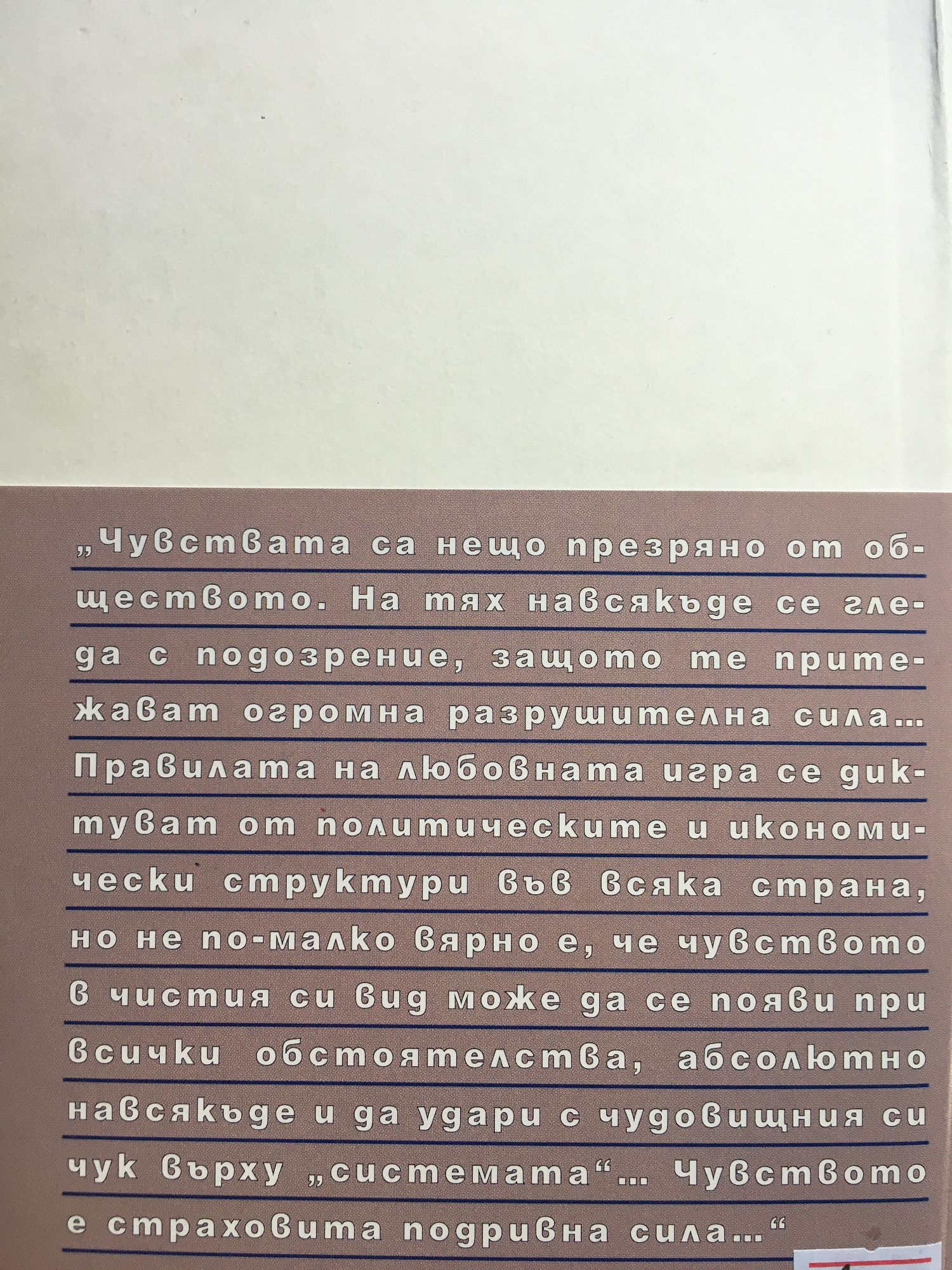 "Чувствата са нещо презряно от обществото. На тях навсякъде се гледа с подозрение, защото те притежават огромна разрушителна сила...Правилата на любовната игра се диктуват от политическите и икономически структури във всяка страна, но не по-малко вярно е, че чувството в чистия си вид може да се появи при всички обстоятелства, абсолютно навсякъде и да удари с чудовищния си чук върху "системата"...Чувството е страховита подривна сила..."