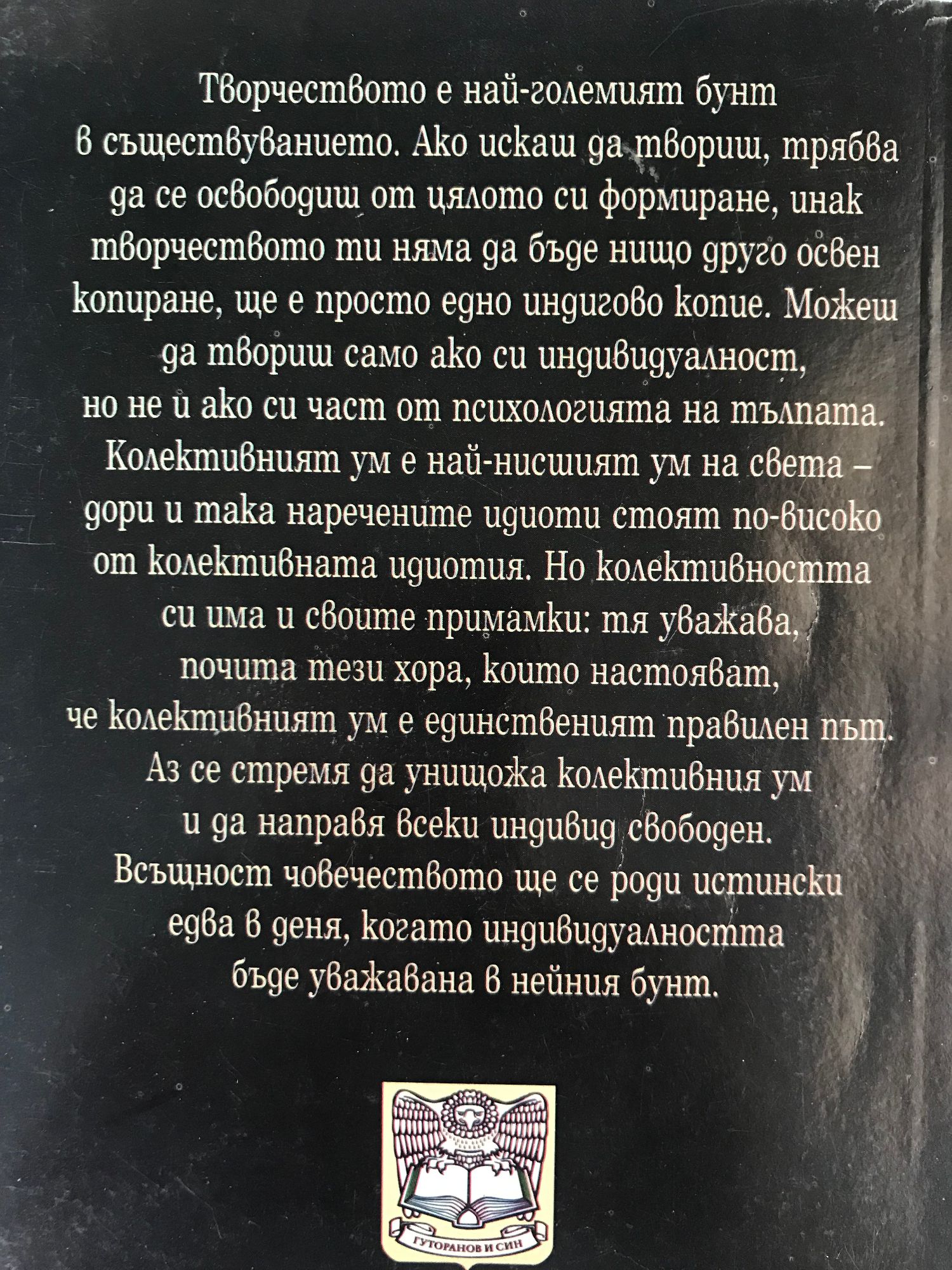 Творчеството е най-големият бунт в съществуванието. Ако искаш да твориш, трябва да се освободиш от цялото си формиране, инак творчеството ти няма да бъде нищо друго освен допиране, ще е просто едно индигово копие. Можеш да твориш само ако си индивидуалност, но не и ако си част от психологията на тълпата. Колективният ум е най-нисшият ум на света - дори и така наречените идиоти стоят по-високо от колективната идиотия. Но колективността си има и своите примамки: тя уважава, почита тези хора, които настояват, че Кколективният ум е единственият правилен път. Аз се стремя да унищожа колективния ум и да направя всеки индивид свободен. Всъщност човечеството ще се роди истински едва в деня, когато индивидуалността бъде уважавана в нейния бунт.