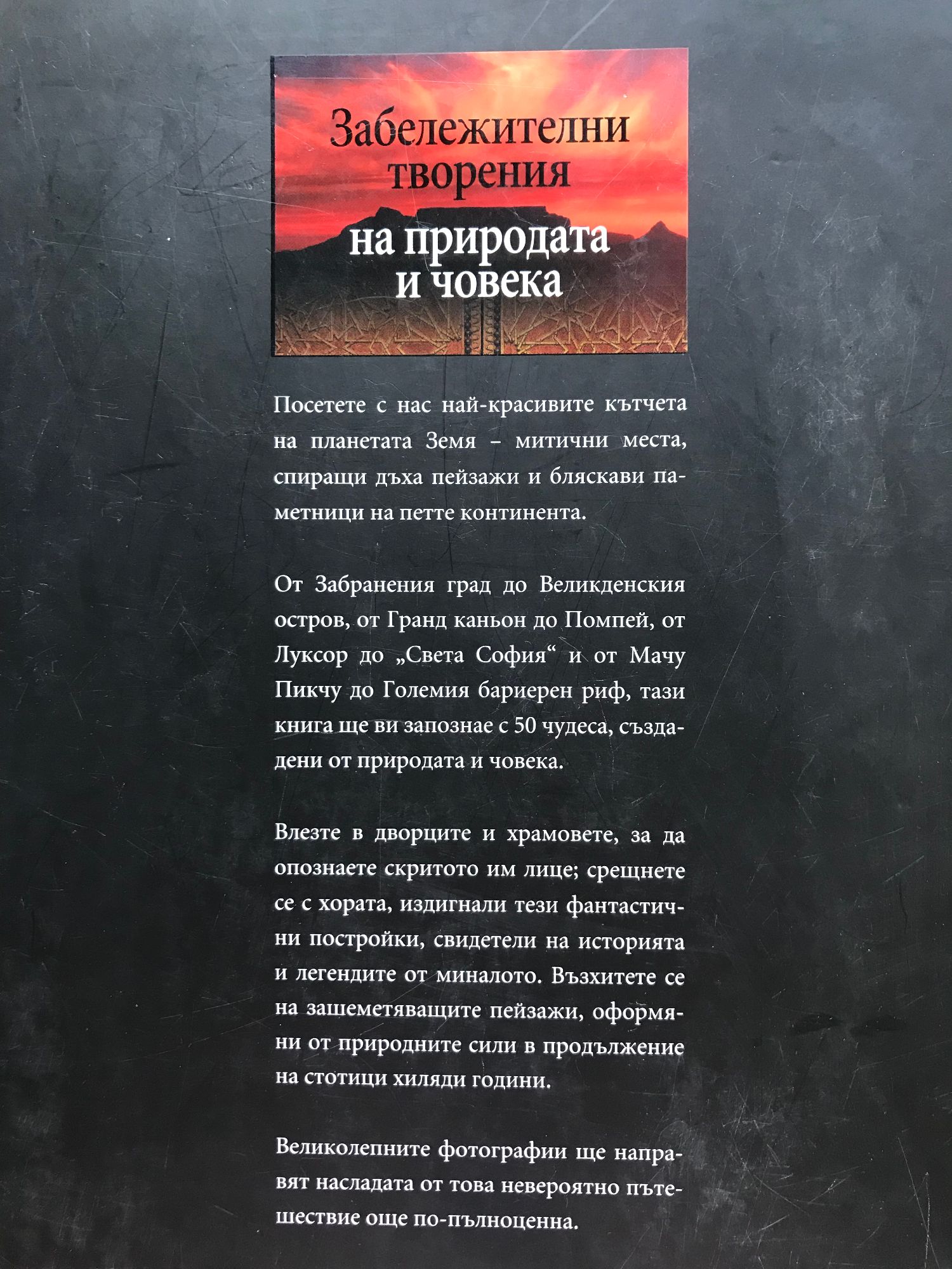 Посетете с нас най-красивите кътчета на планетата Земя - митични места, спиращи дъха пейзажи и бляскави паметници на петте континента. От Забранения град до Великденския остров, от Гранд каньон до Помпей, от Луксор до "Света София" и от Мачу Пикчу до Големия бариерен риф, тази книга ще ви запознае с 50 чудеса, създадени от природата и човека. Влезте в дворците и храмовете, за да опознаете скритото им лице; срещнете се с хората, издигнали тези фантастични постройки, свидетели на историята и легендите от миналото. Възхитете се на зашеметяващите пейзажи, оформяни от природните сили в продължение на стотици хиляди години. Великолепните фотографии ще направят насладата от това невероятно пътешествие още по-пълноценна.