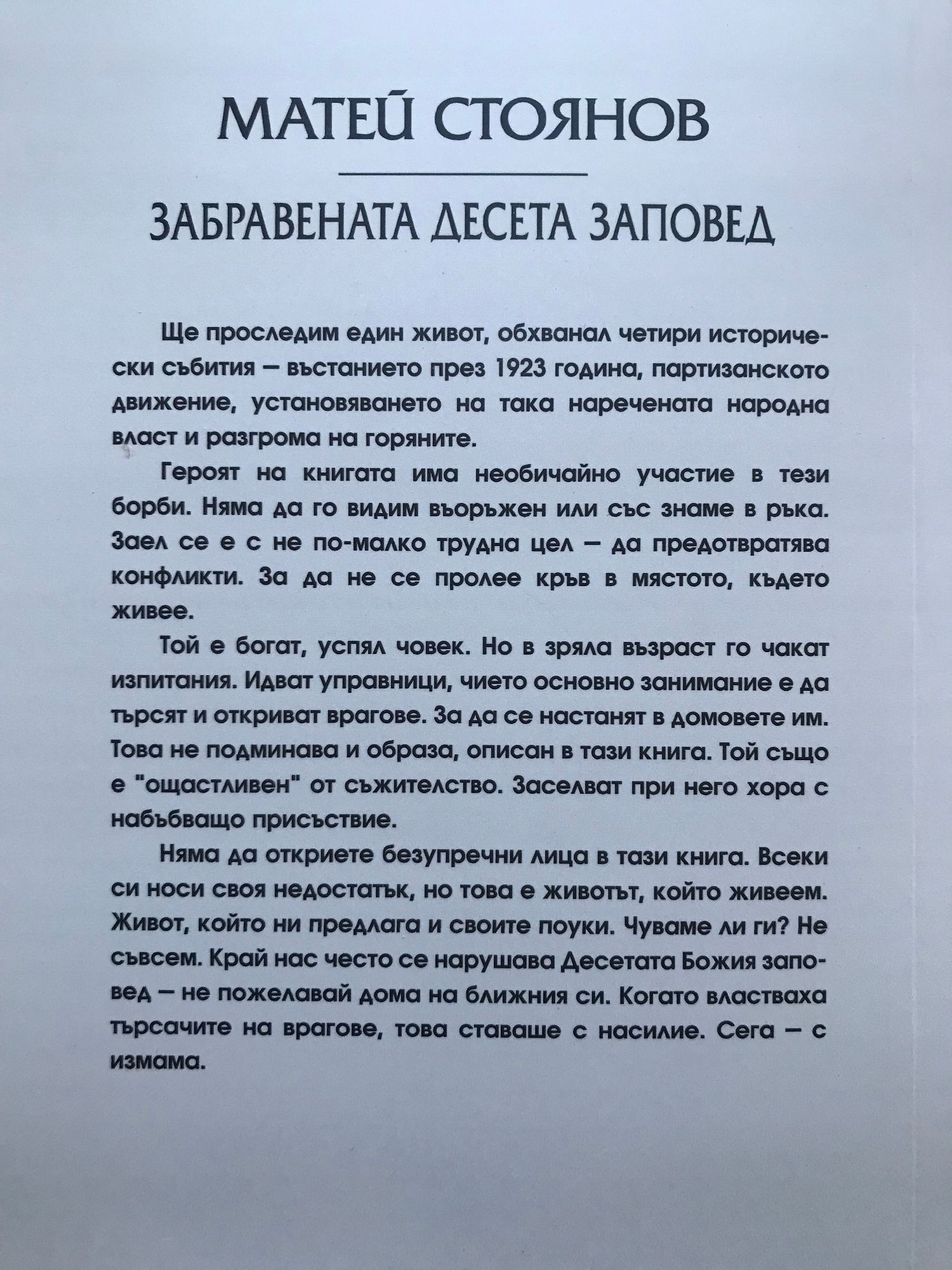 Ще проследим един живот, обхванал четири исторически събития - въстанието през 1923 година, партизанското движение, установяването на така наречената народна власт и разгрома на горяните. Героят на книгата има необичайно участие в тези борби. Няма да го видим въоръжен или със знаме в ръка. Заел се е с не по-малко трудна цел - да предотвратява конфликти. За да не се пролее кръв в мястото, където живее. Той е богат, успял човек. Но в зряла възраст го чакат изпитания. Идват управници, чието основно занимание е да търсят и откриват врагове. За да се настанят в домовете им. Това не подминава и образа, описан в тази книга. Той също е "ощастливен" от съжителство. Заселват при него хора с набъбващо присъствие. Няма да откриете безупречни лица в тази книга. Всеки носи своя недостатък, но това е животът, който живеем. Живот, който ни предлага и своите поуки. Чуваме ли ги? Не съвсем. Край нас често се нарушава Десетата Божия заповед - не пожелавай дома на ближния си. Когато властваха търсачите на врагове, това ставаше с насилие. Сега - с измама.