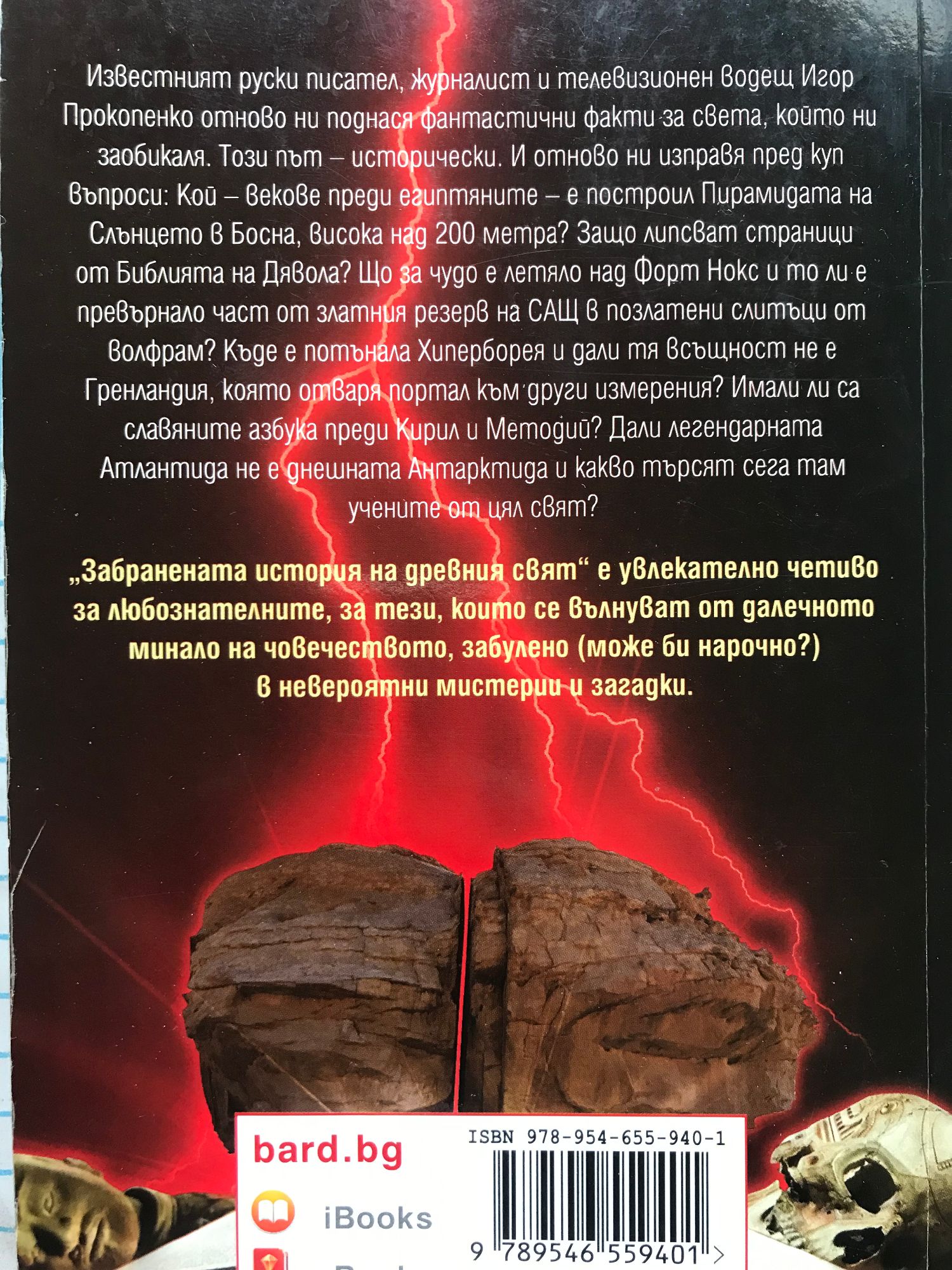 Известният руски писател, журналист и телевизионен водещ Игор Прокопенко отново ни поднася фантастични факти за света, който ни заобикаля. Този път – исторически. И отново ни изправя пред куп въпроси: Кой – векове преди египтяните – е построил Пирамидата на Слънцето в Босна, висока над 200 метра? Защо липсват страници от Библията на Дявола? Що за чудо е летяло над Форт Нокс и то ли е превърнало част от златния резерв на САЩ в позлатени слитъци от волфрам? Къде е потънала Хиперборея и дали тя всъщност не е Гренландия, която отваря портал към други измерения? Имали ли са славяните азбука преди Кирил и Методий? Дали легендарната Атлантида не е днешната Антарктида и какво търсят сега там учените от цял свят? „Забранената история на древния свят“ е увлекателно четиво за любознателните, за тези, които се вълнуват от далечното минало на човечеството, забулено (може би нарочно?) в невероятни мистерии и загадки.