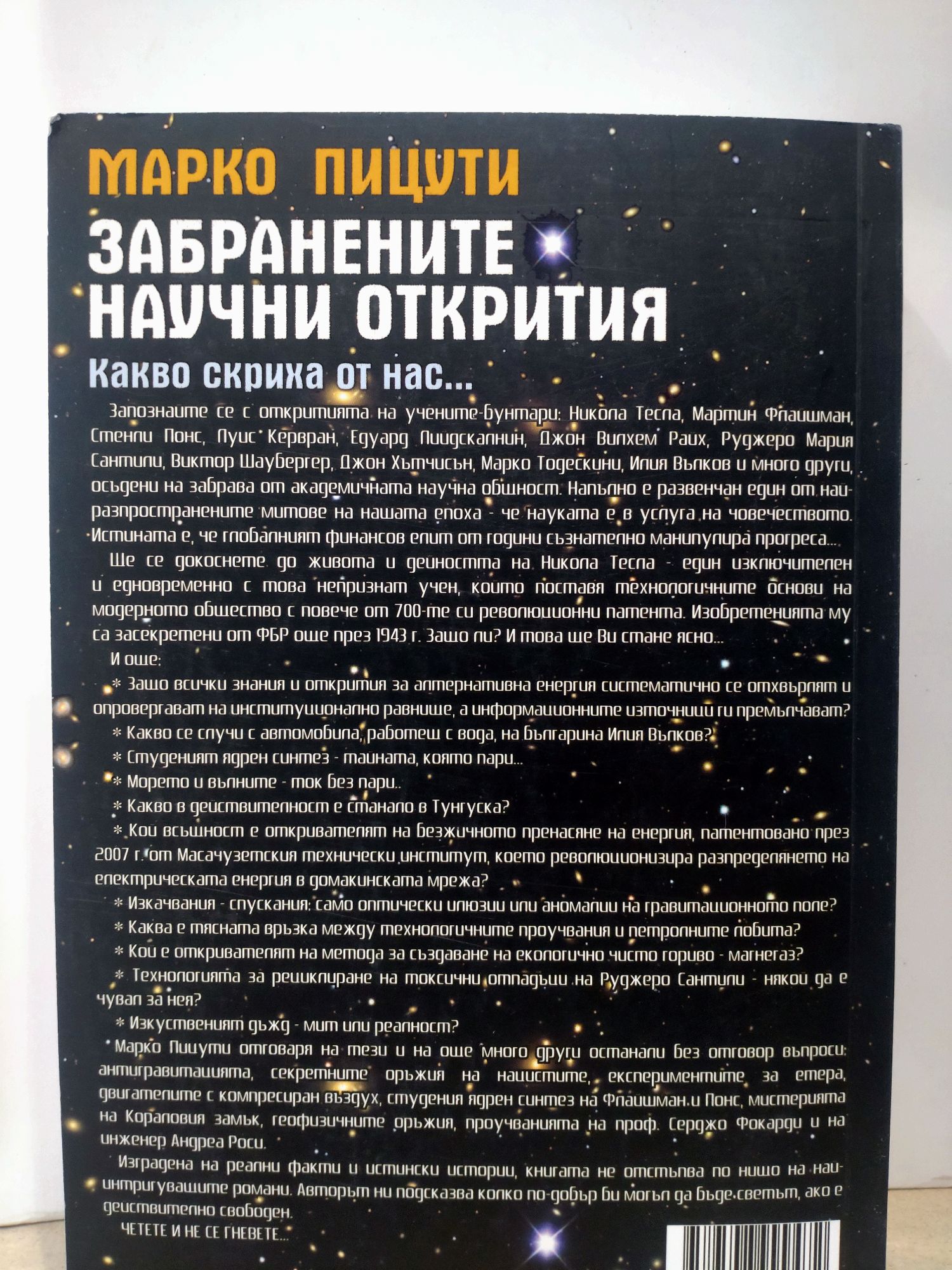 Запознайте се с откритията на учените-бунтари: Никола Тесла, Мартин Флайшман, Стенли Понс, Луис Керван, Едуард Лийдскалнин, Джон Вилхем Райх, Руджеро Мария Сантили, Виктор Шаубергер, Джон Хътчисън, Марко Тодескини, Илия Вълков и много други, осъдени на забрава от академичната научна общност. Напълно е развенчан един от най-разпространените митове на нашата епоха – че науката е в услуга на човечеството. Истината е, че глобалният финансов елит от години съзнателно манипулира прогреса. Ще се докоснете до живота и дейността на Никола Тесла – един изключителен и едновременно с това непризнат учен, който поставя технологичните основи на модерното общество с повече от 700-те си революционни патента. Изобретенията му са засекретени от ФБР още през 1943 г. Защо ли? И това ще Ви стане ясно...