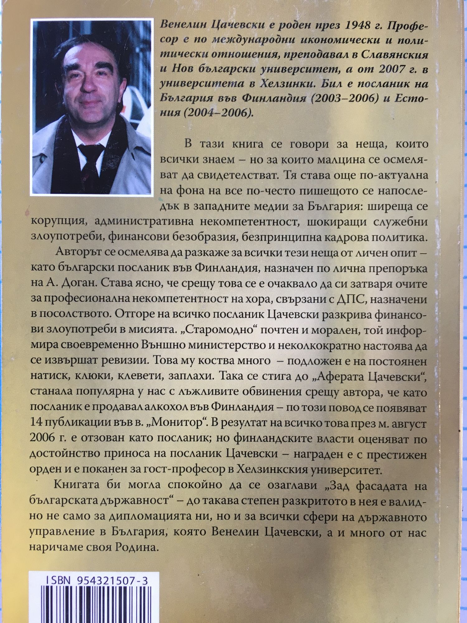 В тази книга се говори за неща, които всички знаем - но за които малцина се осмеляват да свидетелстват. Тя става още по-актуална на фона на все по-често пишещото се напоследък в западните медии за България: ширеща се корупция, административна некомпетентност, шокиращи служебни злоупотреби, финансови безобразия, безпринципна кадрова политика. Авторът се осмелява да разкаже за всички тези неща от личен опит - като български посланик във Финландия, назначен по лична препоръка на А. Доган. Става ясно, че срещу това се е очаквало да си затваря очите за професионална некомпетентност на хора, свързани с ДПС, назначени в посолството. Отгоре на всичко посланик Цачевски разкрива финансови злоупотреби в мисията. „Старомодно“ почтен и морален, той информира своевременно Външно министерство и неколкократно настоява да се извършат ревизии. Това му коства много - подложен е на постоянен натиск, клюки, клевети, заплахи. Така се стига до „Аферата Цачевски“, станала популярна у нас с лъжливите обвинения срещу автора, че като посланик е продавал алкохол във Финландия - по този повод се появяват 14 публикации във в. „Монитор“. В резултат на всичко това през м. август 2006 г. е отзован като посланик; но финландските власти оценяват по достойнство приноса на посланик Цачевски - награден е с престижен орден и е поканен за гост-професор в Хелзинкския университет. Книгата би могла спокойно да се озаглави „Зад фасадата на българската държавност“ - до такава степен разкритото в нея е валидно не само за дипломацията ни, но и за всички сфери на държавното управление в България, която Венелин Цачевски, а и много от нас наричаме своя Родина.