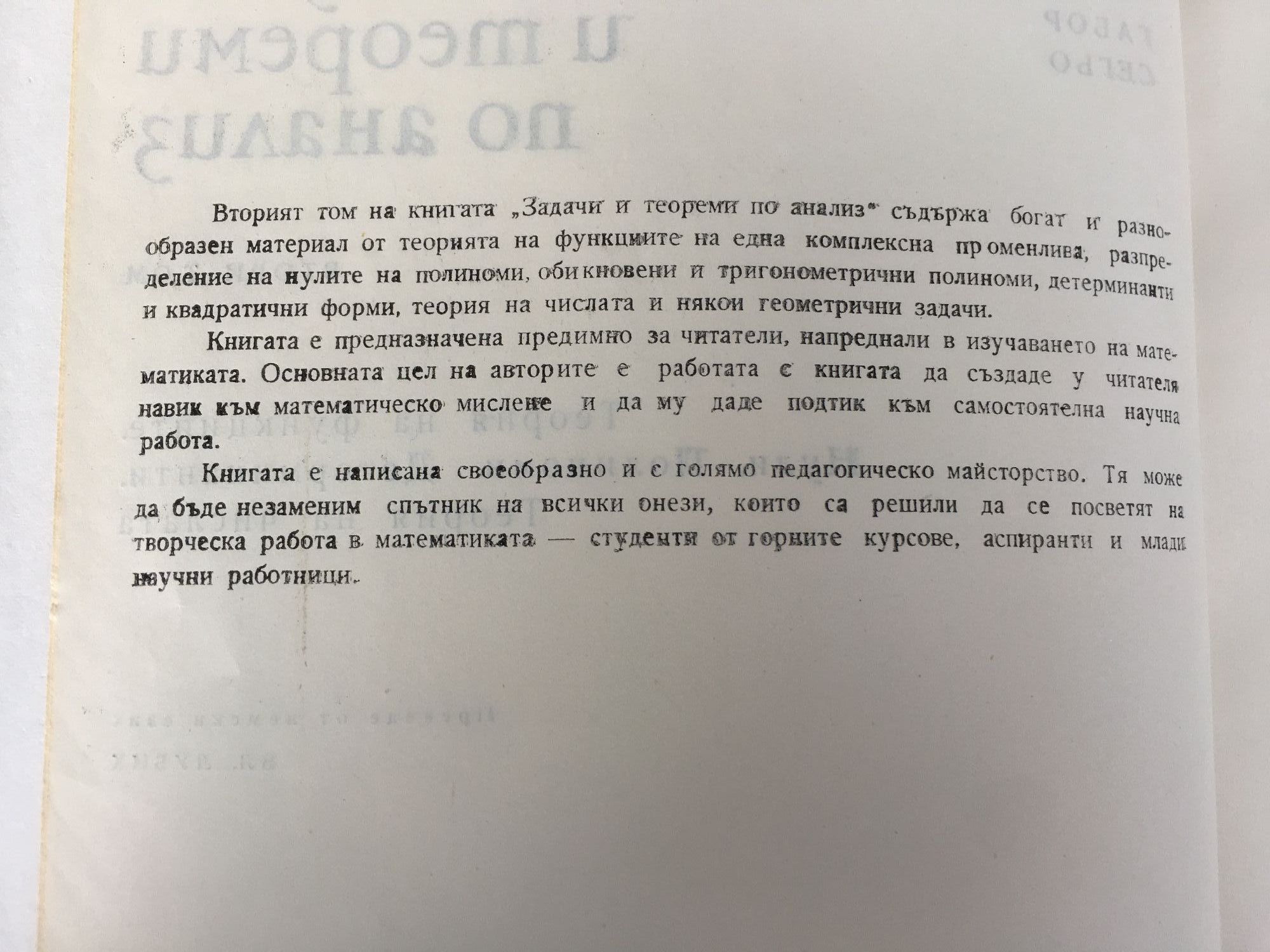 Том 1: Редове. Интегрално смятане. Теория на функциите. Том 2: Теория на функциите. Нули. Полиноми. Детерминанти. Теория на числата.