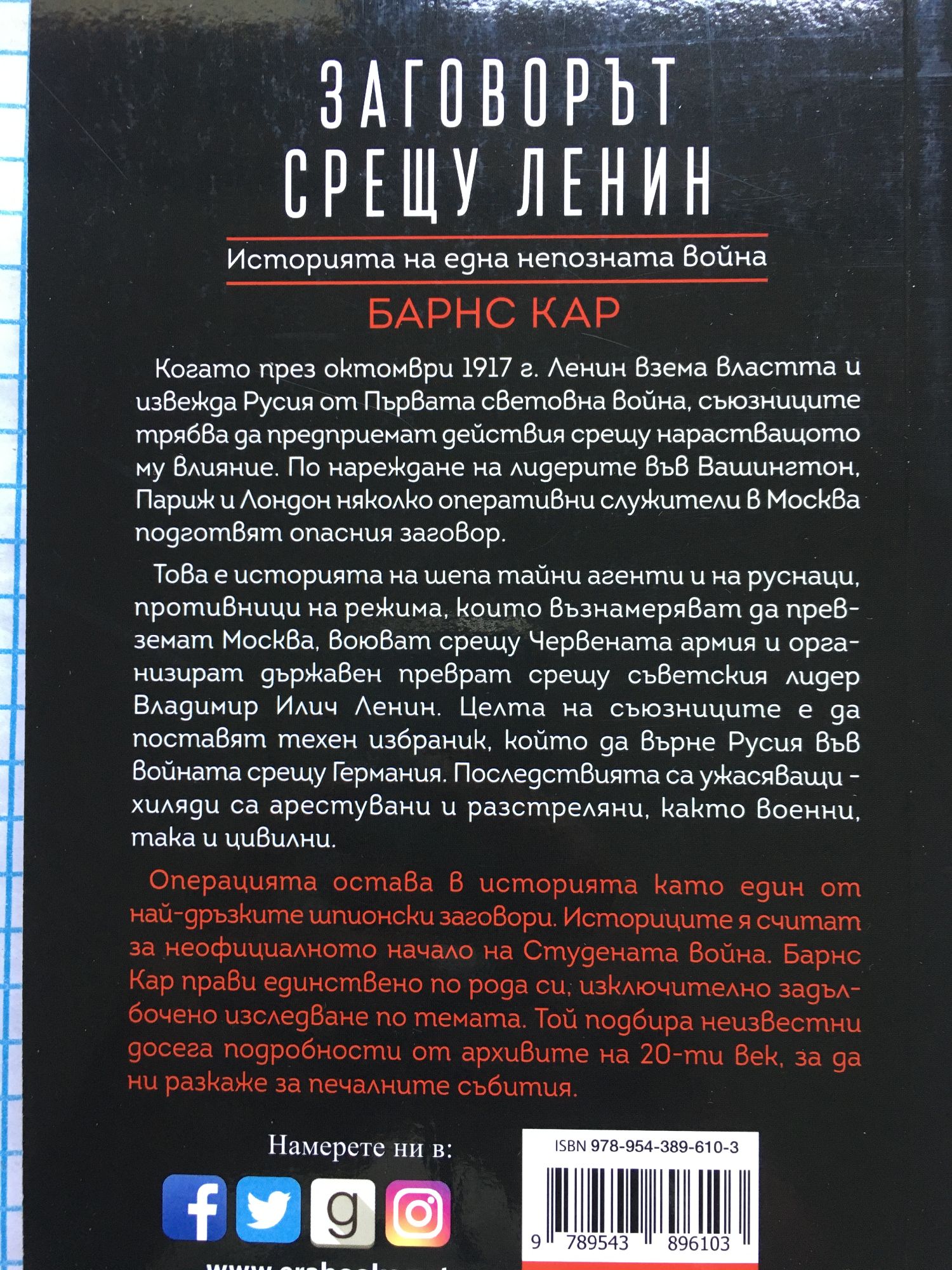 Когато през октомври 1917 г. Ленин взема властта и извежда Русия от Първата световна война, съюзниците трябва да предприемат действия срещу нарастващото му влияние. По нареждане на лидерите във Вашингтон, Париж и Лондон няколко оперативни служители в Москва подготвят опасния заговор. Това е историята на шепа тайни агенти и на руснаци, противници на режима, които възнамеряват да превземат Москва, воюват срещу Червената армия и организират държавен преврат срещу съветския лидер Владимир Илич Ленин. Целта на съюзниците е да поставят техен избраник, който да върне Русия във войната срещу Германия. Последствията са ужасяващи - хиляди са арестувани и разстреляни, както военни, така и цивилни. Операцията остава в историята като един от най-дръзките шпионски заговори. Историците я считат за неофициалното начало на Студената война. Барнс Кар прави единствено по рода си, изключително задълбочено изследване по темата. Той подбира неизвестни досега подробности от архивите на 20-ти век, за да ни разкаже за печалните събития.