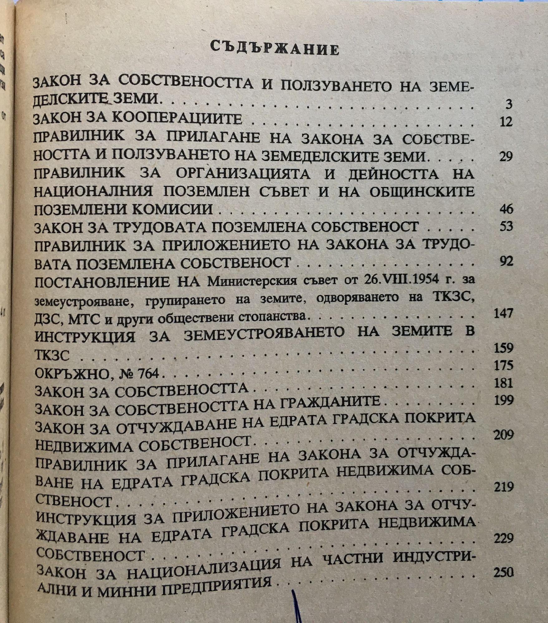 Закон за собствеността и ползуването на земеделски земи. Закон за кооперациите. Закон за трудовата поземлена собственост. Закон за собствеността. Закон за собствеността на гражданите. Закон за отчуждаването на едрата градска покрита недвижима собственост. Закон за национализация на частни индустриални и минни предприятия.