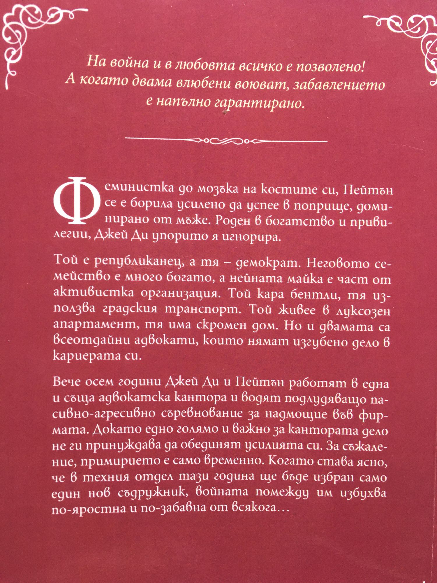 На война и в любовта всичко е позволено! А когато двама влюбени воюват, забавлението е напълно гарантирано. Феминистка до мозъка на костите си, Пейтън се е борила усилено да успее в поприще, доминирано от мъже. Роден в богатство и привилегии, Джей Ди упорито я игнорира. Той е републиканец, а тя – демократ. Неговото семейство е много богато, а нейната майка е част от активистка организация. Той кара бентли, тя използва градския транспорт. Той живее в луксозен апартамент, тя има скромен дом. Но и двамата са всеотдайни адвокати, които нямат изгубено дело в кариерата си. Вече осем години Джей Ди и Пейтън работят в една и съща адвокатска кантора и водят подлудяващо пасивно-агресивно съревнование за надмощие във фирмата. Докато едно голямо и важно за кантората дело не ги принуждава да обединят усилията си. За съжаление, примирието е само временно. Когато става ясно, че в техния отдел тази година ще бъде избран само един нов съдружник, войната помежду им избухва по-яростна и по-забавна от всякога…