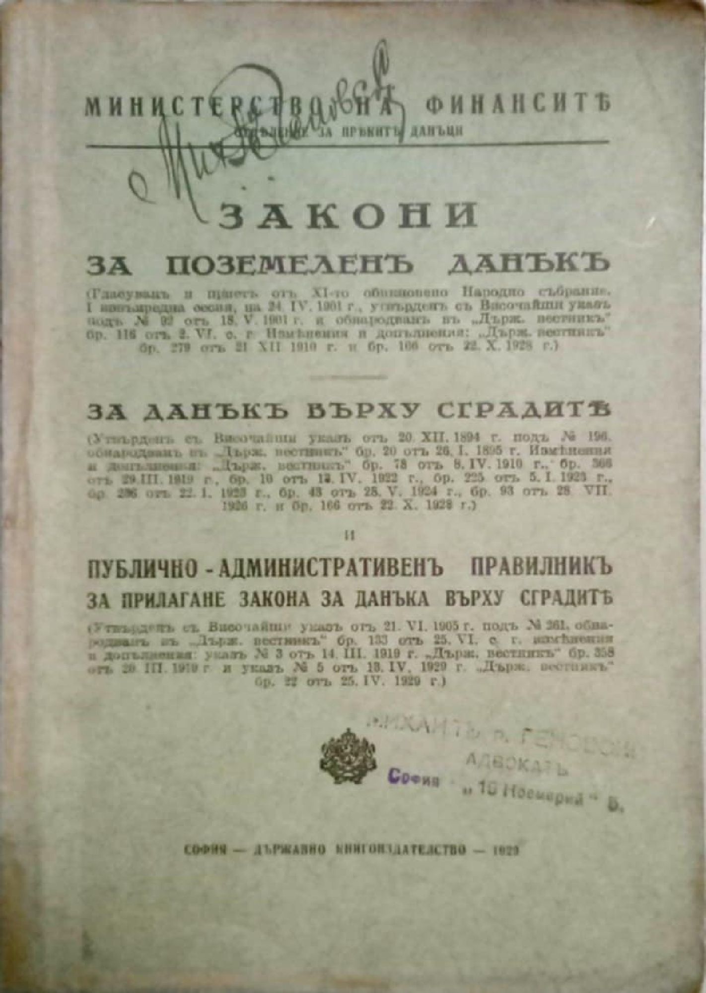 Закони за поземленъ данъкъ, за данъкъ върху сградите и публично административенъ правилникъ за прилагане на Закона за данъка върху сградите / Закони за поземлен данък, за данък върху сградите и публично административен правилник за прилагане на Закона за данъка върху сградите