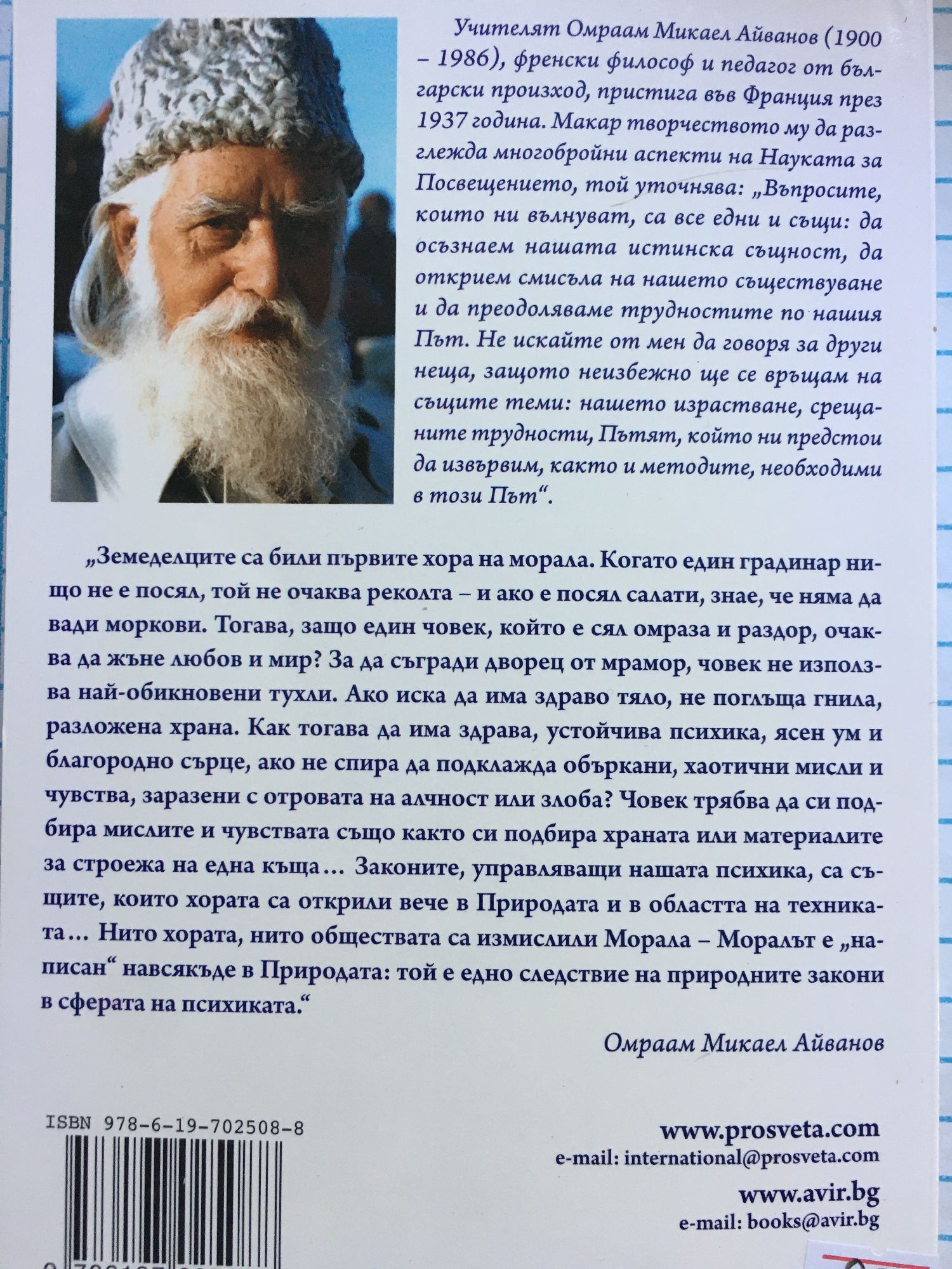 "Земеделците са били първите хора на морала. Когато един градинар нищо не е посял, той не очаква реколта – и ако е посял салати, знае, че няма да вади моркови. Тогава, защо един човек, който е сял омраза и раздор, очаква да жъне любов и мир? За да съгради дворец от мрамор, човек не използва най-обикновени тухли. Ако иска да има здраво тяло, не поглъща гнила, разложена храна. Как тогава да има здрава, устойчива психика, ясен ум и благородно сърце, ако не спира да подклажда объркани, хаотични мисли и чувства, заразени с отровата на алчност или злоба? Човек трябва да си подбира мислите и чувствата също както си подбира храната или материалите за строежа на една къща... Законите, управляващи нашата психика, са същите, които хората са открили вече в Природата и в областта на техниката... Нито хората, нито обществата са измислили Морала – Моралът е "написан" навсякъде в Природата: той е едно следствие на природните закони в сферата на психиката."