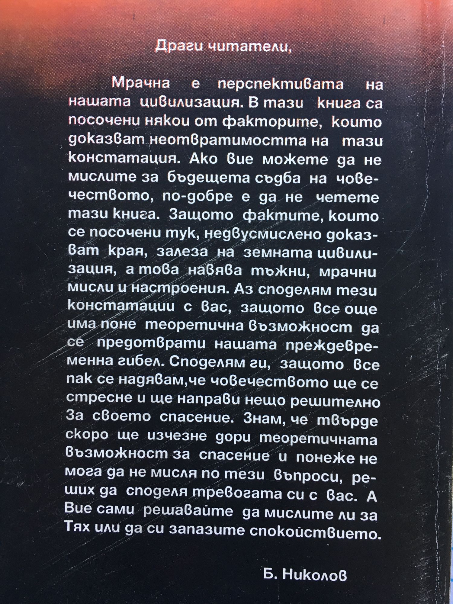 Драги читатели. Мрачна е перспективата на нашата цивилизация. В тази книга са посочени някои от факторите, които доказват неотвратимостта на тази констатация. Ако вие можете да не мислите за бъдещата съдба на човечеството, по-добре е да не четете тази книга. Защото фактите, които се посочени тук, недвусмислено доказват края, залеза на земната цивилизация, а това навява тъжни, мрачни мисли и настроения. Аз споделям тези констатации с вас, защото все още има поне теоретична възможност да се предотврати нашата преждевременна гибел. Споделям ги, защото все пак се надявам, че човечеството ще се стресне и ще направи нещо решително За своето спасение. Знам, че твърде скоро ще изчезне дори теоретичната възможност за спасение и понеже не мога да не мисля по тези въпроси, реших да споделя тревогата си с вас. А Вие сами решавайте да мислите ли за Тях или да си запазите спокойствието. Б. Николов