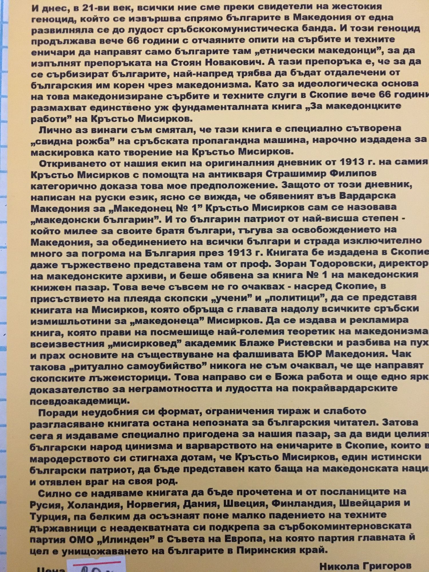 И днес, в 21-ви век, всички ние сме преки свидетели на жестокия геноцид, който се извършва .спрямо българите в Македония от една развилняла се до лудост сръбскокомунистическа банда. И този геноцид продължава вече 66 години с отчаяните опити на сърбите и техните еничари да направят само българите там „етнически македонци", за да изпълнят препоръката на Стоян Новакович. А тази препоръка е, че за да се сърбизират българите, най-напред трябва да бъдат отдалечени от българския им корен чрез македонизма. Като за идеологическа основа на това македонизиране сърбите и техните слуги в Скопие вече 66 години размахват единствено уж фундаменталната книга „За македонцките работи" на Кръстьо Мисирков. Лично аз винаги съм смятал, че тази книга е специално сътворена „свидна рожба" на сръбската пропагандна машина, нарочно издадена за маскировка като творение на Кръстьо Мисирков. Откриването от нашия екип на оригиналния дневник от 1913 г. на самия Кръстьо Мисирков с помощта на антикваря Страшимир Филипов категорично доказа това мое предположение. Защото от този дневник, написан на руски език, ясно се вижда, че обявеният във Вардарска Македония за „Македонец № 1" Кръстьо Мисирков сам се назовава „македонски българин". И то българин патриот от най-висша степен - който милее за своите братя българи, тъгува за освобождението на Македония, за обединението на всички българи и страда изключително много за погрома на България през 1913 г. Книгата бе издадена в Скопие, даже тържествено представена там от проф. Зоран Тодоровски, директор на македонските архиви, и беше обявена за книга № 1 на македонския книжен пазар. Това вече съвсем не го очаквах - насред Скопие, в присъствието на плеяда скопски „учени" и „политици", да се представя книгата на Мисирков, която обръща с главата надолу всичките сръбски измишльотини за „македонеца" Мисирков. Да се издава и рекламира книга, която прави на посмешище най-големия теоретик на македонизма, всеизвестния „мисирковед" академик Блаже Ристевски и разбива на пух и прах основите на съществуване на фалшивата БЮР Македония. Чак такова „ритуално самоубийство" никога не съм очаквал, че ще направят скопските лъжеисторици. Това направо си е Божа работа и още едно ярко доказателство за неграмотността и лудостта на покрайвардарските псевдоакадемици. Поради неудобния си формат, ограничения тираж и слабото разгласяване книгата остана непозната за българския читател. Затова сега я издаваме специално пригодена за нашия пазар, за да види целият български народ цинизма и варварството на еничарите в Скопие, които в мародерството си стигнаха дотам, че Кръстьо Мисирков, един истински български патриот, да бъде представен като баща на македонската нация и отявлен враг на своя род. Силно се надяваме книгата да бъде прочетена и от посланиците на Русия, Холандия, Норвегия, Дания, Швеция, Финландия, Швейцария и Турция, па белким да осъзнаят поне малко падението на техните държавници с неадекватната си подкрепа за сърбокоминтерновската партия ОМО „Илинден" в Съвета на Европа, на която партия главната й цел е унмножаването на българите в Пиринския край. Никола Григоров