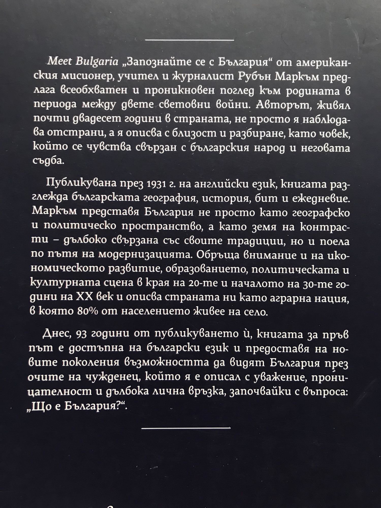 Запознайте се с България от американския мисионер, учител и журналист Рубън Маркъм предлага всеобхватен и проникновен поглед към родината в периода между двете световни войни. Авторът, живял почти двадесет години в страната, не просто я наблюдава отстрани, а я описва с близост и разбиране, като човек, който се чувства свързан с българския народ и неговата съдба. Публикувана през 1931 г. на английски език, книгата разглежда българската география, история, бит и ежедневие. Маркъм представя България не просто като географско и политическо пространство, а като земя на контрасти - дълбоко свързана със своите традиции, но и поела по пътя на модернизацията. Обръща внимание и на икономическото развитие, образованието, политическата и културната сцена в края на 20-те и началото на 30-те години на XX век и описва страната ни като аграрна нация, в която 80% от населението живее на село. Днес, 93 години от публикуването ѝ, книгата за пръв път е достъпна на български език и предоставя на новите поколения възможността да видят България през очите на чужденец, който я е описал с уважение, проницателност и дълбока лична връзка, започвайки с въпроса: "Що е България?".