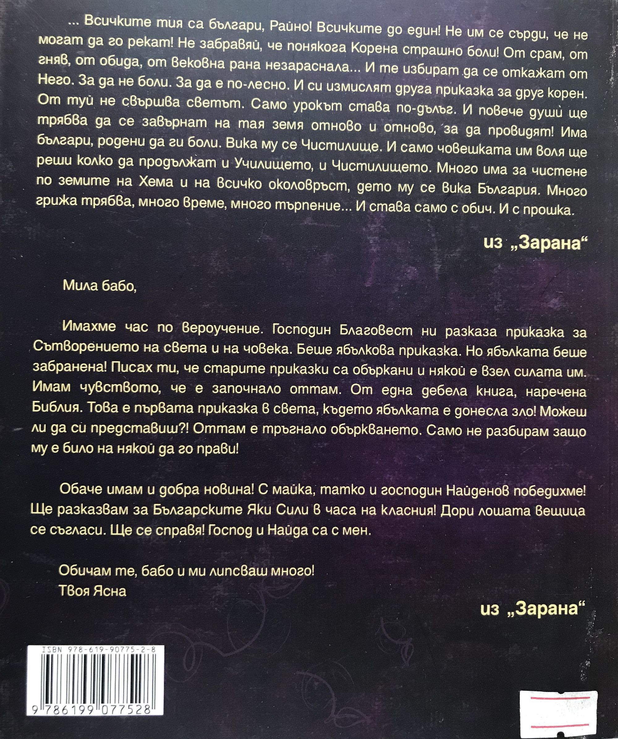 … Всичките тия са българи, Райно! Всичките до един! Не им се сърди, че не могат да го рекат! Не забравяй, че понякога Корена страшно боли! От срам, от гняв, от обида, от вековна рана незараснала… И те избират да се откажат от Него. За да не боли. За да е по-лесно. И си измислят друга приказка за друг корен. От туй не свършва светът. Само урокът става по-дълъг. И повече души ще трябва да се завърнат на тая земя отново и отново, за да провидят! Има българи, родени да ги боли. Вика му се Чистилище. И само човешката им воля ще реши колко да продължат и Училището, и Чистилището.. Много има за чистене по земите на Хема и на всичко околовръст, дето му се вика България. Много грижа трябва, много време, много търпение… И става само с обич. И с прошка. Из „Зарана“.