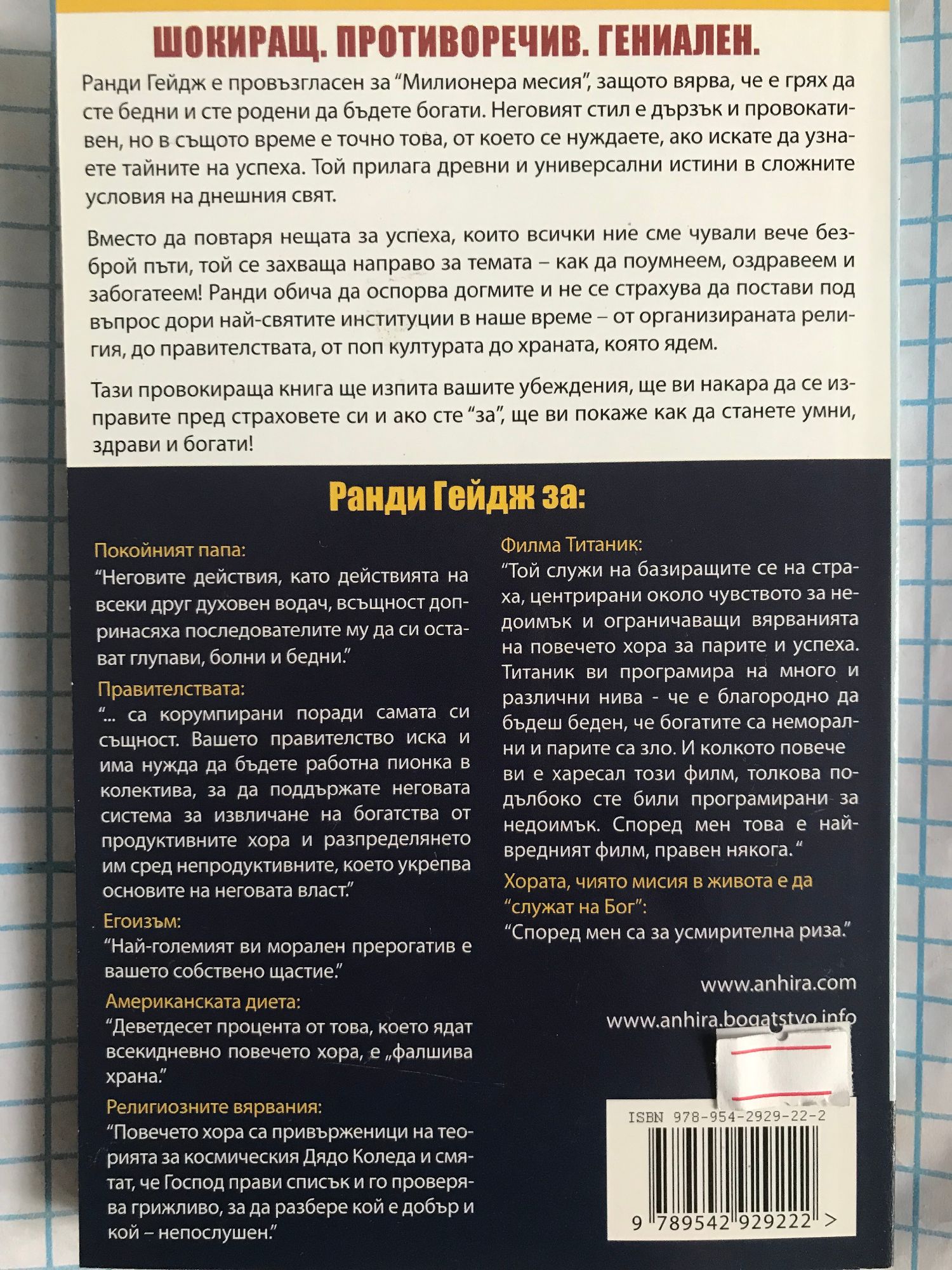"Защо си Глупав, Болен и Беден... и как да станеш Умен, Здрав и Богат" не е книга от типа "Как да забогатеем за една нощ, без да се налага да правим каквото и да е било". Може би заглавието на книгата първоначално навежда на такава мисъл, но това е грешка! Всъщност, заглавието е много правдиво и точно отразява съдържанието, тъй като Ранди Гейдж посочва пътя за това как да спрем да бъдем с промити мозъци, с лошо здраве и едва свързващи двата края до следващата заплата и да започнем да се опитваме да достигнем състояние на просперитет. За Ранди Гейдж просперитет далеч не са само парите, а комбинация от физическо и психическо здраве, баланс, удовлетвореност, материални придобивки, духовно развитие. Но най-вече, за да просперираме, ние трябва да сме щастливи! За Ранди Гайдж казват, че е "Милионера месия", защото вярва, че е грях да сте бедни и сте родени да бъдете богати. Неговият стил е дързък и провокативен, но в същото време е точно това, от което се нуждаете, ако искате да узнаете тайните на успеха. Той прилага древни и универсални истини в сложните условия на днешния свят. В книгата си "Защо си Глупав, Болен и Беден... и как да станеш Умен, Здрав и Богат" Ранди Гейдж показва как: Да се освободим от чуството, че сме жертва Да повярваме, че се всеки може да постигне просперитета, който желае Да си създадем ментална настройка за просперитет Да разберем необходимостта от добре информиран и освободен от предрасъдъци егоизъм "Защо си Глупав, Болен и Беден... и как да станеш Умен, Здрав и Богат" е провокираща книга, която ще изпита вашите убеждения, ще ви накара да се изправите пред страховете си и ако сте "'за", ще ви покаже как да сте умни, здрави и богати! Това е книга, която има за цел да ви покаже, че можете да имате много повече здраве, щастие, пари и радост в живота си, просто ако се отърсите от страховете си, проявите здравословна доза егоизъм и заобичате самите себе си.