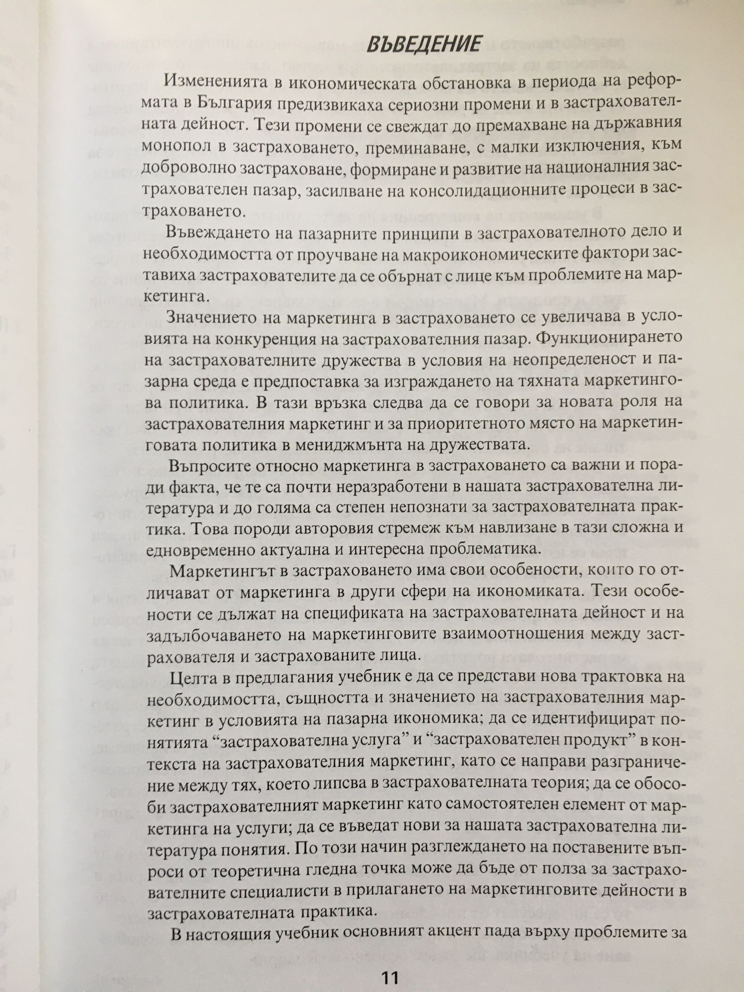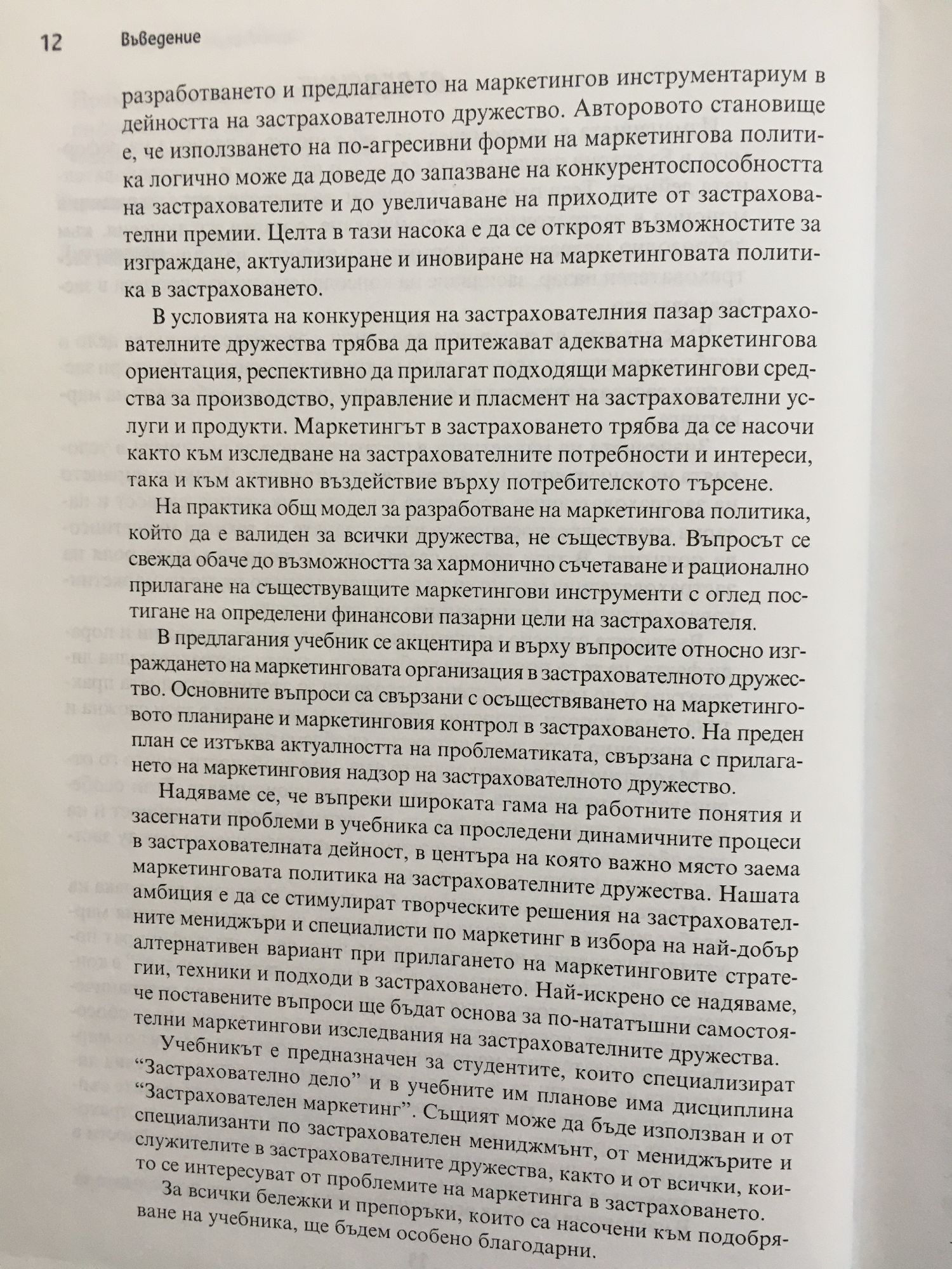 Целта в предлагания учебник е да се представи нова трактовка на необходимостта, същността и значението на застрахователния маркетинг при пазарна икономика; да се идентифицират понятията „застрахователна услугаˮ и „застрахователен продуктˮ в кон текста на застрахователния маркетинг, като се направи разграничение между тях, което липсваше в застрахователната теория; да се обособи застрахователният маркетинг като самостоятелен елемент от маркетинга на услуги; да се въведат нови за нашата застрахователна литература понятия. По този начин разглеждането на поставените въпроси от теоретична гледна точка може да бъде от полза за застрахователните специалисти в прилагането на маркетинговите дейности в застрахователната практика.