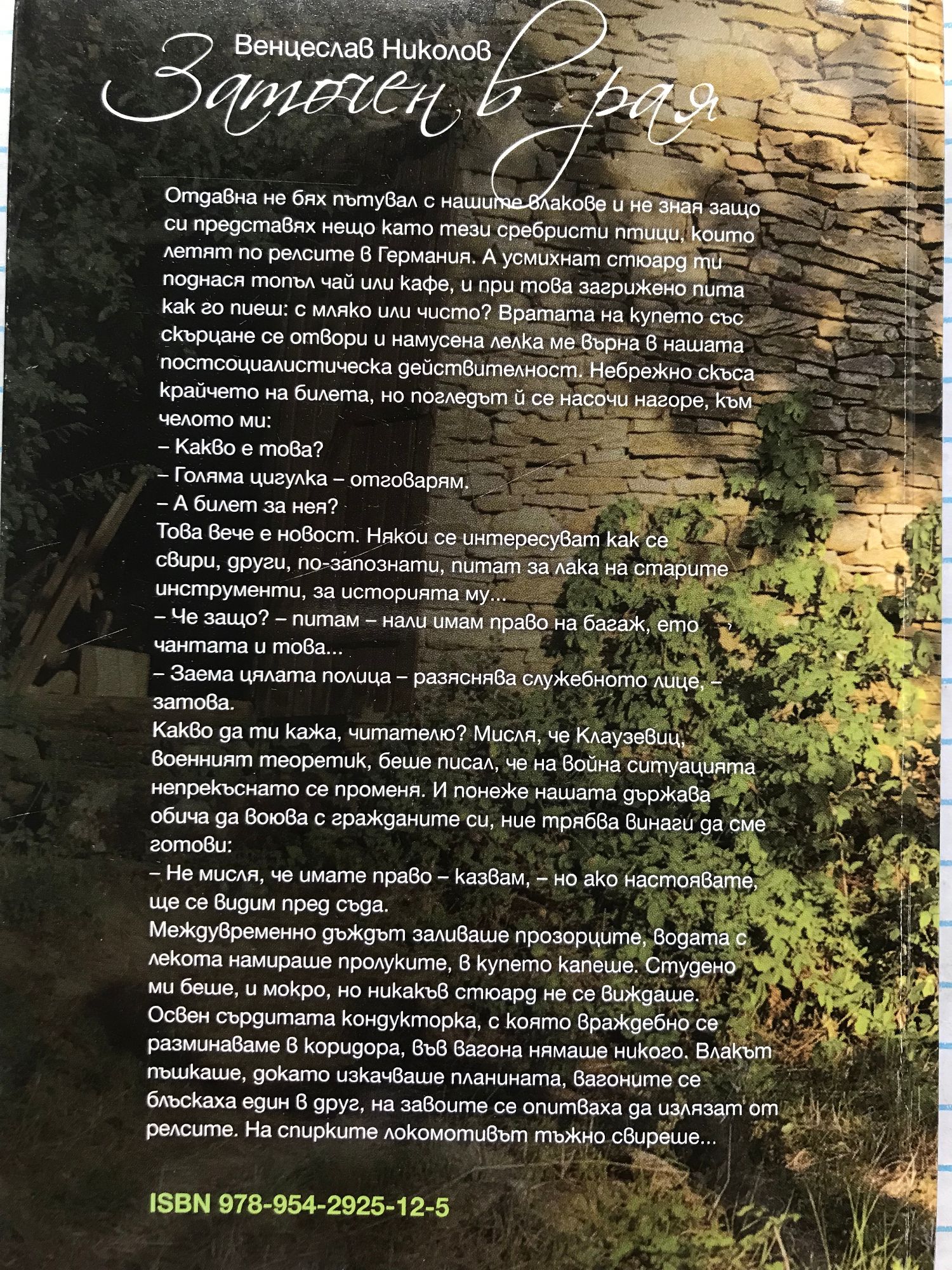 Отдавна не бях пътувал с нашите влакове и не зная защо си представях нещо като тези сребристи птици, които летят по релсите в Германия. А усмихнат стюард ти поднася топъл чай или кафе, и при това загрижено пита как го пиеш: с мляко или чисто? Вратата на купето със скърцане се отвори и намусена лелка ме върна в нашата постсоциалистическа действителност. Небрежно скъса крайчето на билета, но погледът й се насочи нагоре, към челото ми: - Какво е това? - Голяма цигулка - отговарям. - А билет за нея? Това вече е новост. Някои се интересуват как се свири, други, no-запознати, питат за лака на старите инструменти, за историята му... - Че защо? - питам - нали имам право на багаж, ето чантата и това... - Заема цялата полица - разяснява служебното лице, -затова. Какво да ти кажа, читателю? Мисля, че Клаузевиц, военният теоретик, беше писал, че на война ситуацията непрекъснато се променя. И понеже нашата държава обича да воюва с гражданите си, ние трябва винаги да сме готови: - Не мисля, че имате право - казвам, - но ако настоявате, ще се видим пред съда. Междувременно дъждът заливаше прозорците, водата с лекота намираше пролуките, в купето капеше. Студено ми беше, и мокро, но никакъв стюард не се виждаше. Освен сърдитата кондукторка, с която враждебно се разминаваме в коридора, във вагона нямаше никого. Влакът пъшкаше, докато изкачваше планината, вагоните се блъскаха един в друг, на завоите се опитваха да излязат от релсите. На спирките локомотивът тъжно свиреше...