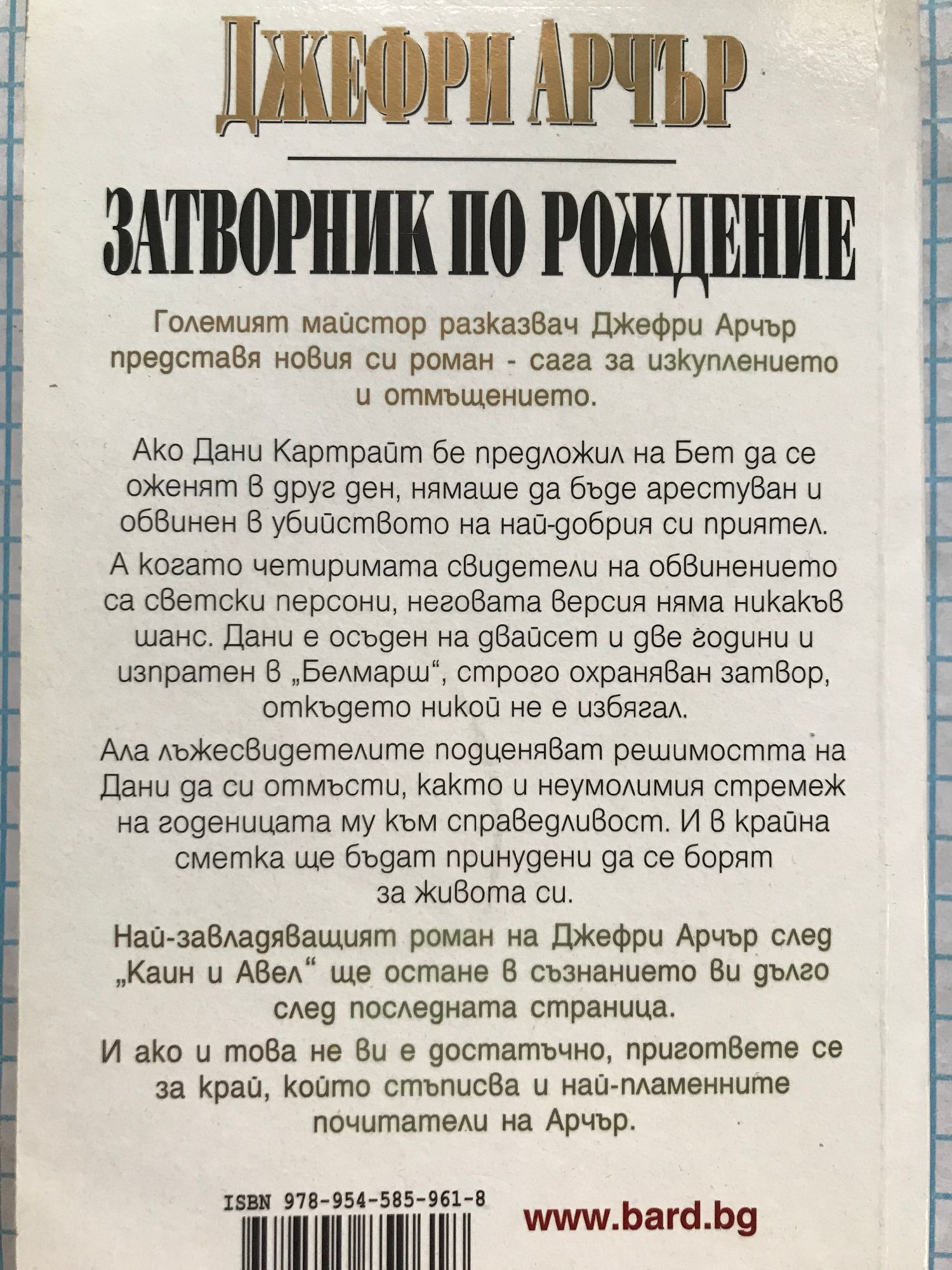Големият майстор разказвач Джефри Арчър представя новия си роман - сага за изкуплението и отмъщението. Ако Дани Картрайт бе предложил на Бет да се оженят в друг ден, нямаше да бъде арестуван и обвинен в убийството на най-добрия си приятел. А когато четиримата свидетели на обвинението са светски персони, неговата версия няма никакъв шанс. Дани е осъден на двайсет и две години и изпратен в „Белмарш”, строго охраняван затвор, откъдето никой не е избягал. Ала лъжесвидетелите подценяват решимостта на Дани да си отмъсти, както и неумолимия стремеж на годеницата му към справедливост. И в крайна сметка ще бъдат принудени да се борят за живота си. Най-завладяващият роман на Джефри Арчър след „Каин и Авел”ще остане в съзнанието ви дълго след последната страница. И ако и това не ви е достатъчно, пригответе се за край, който стъписва и най-пламенните почитатели на Арчър.