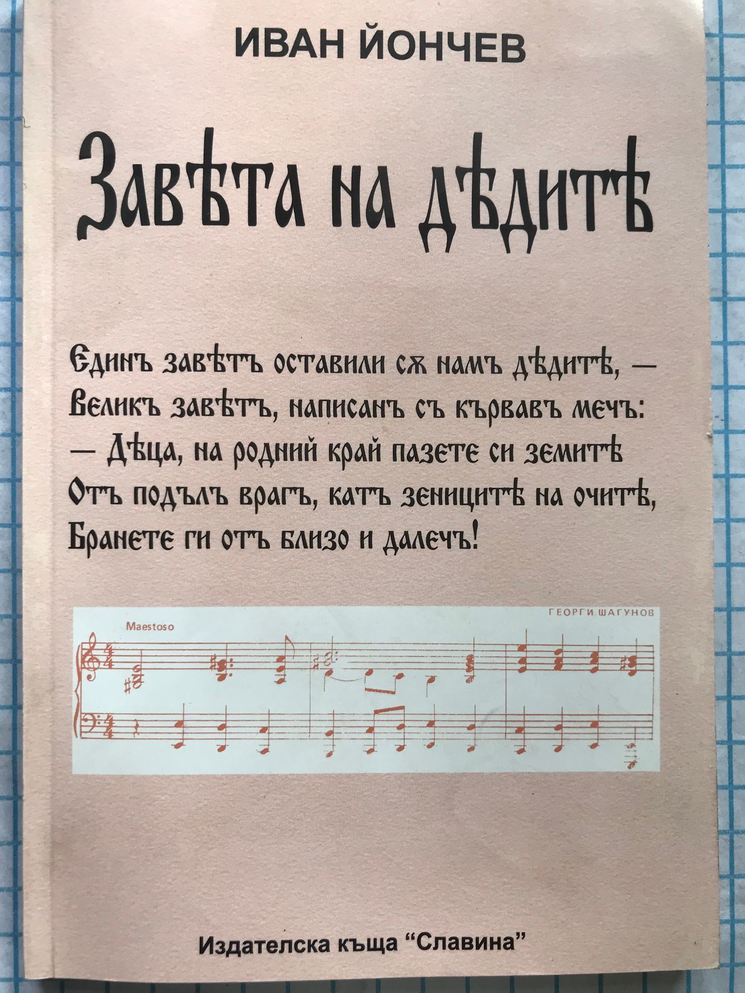 Един завет оставили са нам дедите — велик завет, написан с кървав меч: — „Деца, на родний край пазете си земите от подъл враг, кат зеницата на очите бранете ги от близо и далеч!…“ И тоз завет на миналото грял е в дните кат дивен фар, и вожд той бил е драг на всички тез, кои загинаха в борбите за род, за родна чест, презрели суетите на грешний свят, презрели бащин праг. И не ли той под родно знаме днес войските събира пак? И не ли тоз свещен завет на всички тям сгрява им душите и вика ги в борба неравна със вразите без жал да мрат за бащин край рожден?… Един завет оставили с нам дедите — велик завет, написан с кървав меч: — „Деца, на родний край пазете си земите от подъл враг, кат зеницата на очите бранете ги от близо и далеч!…“