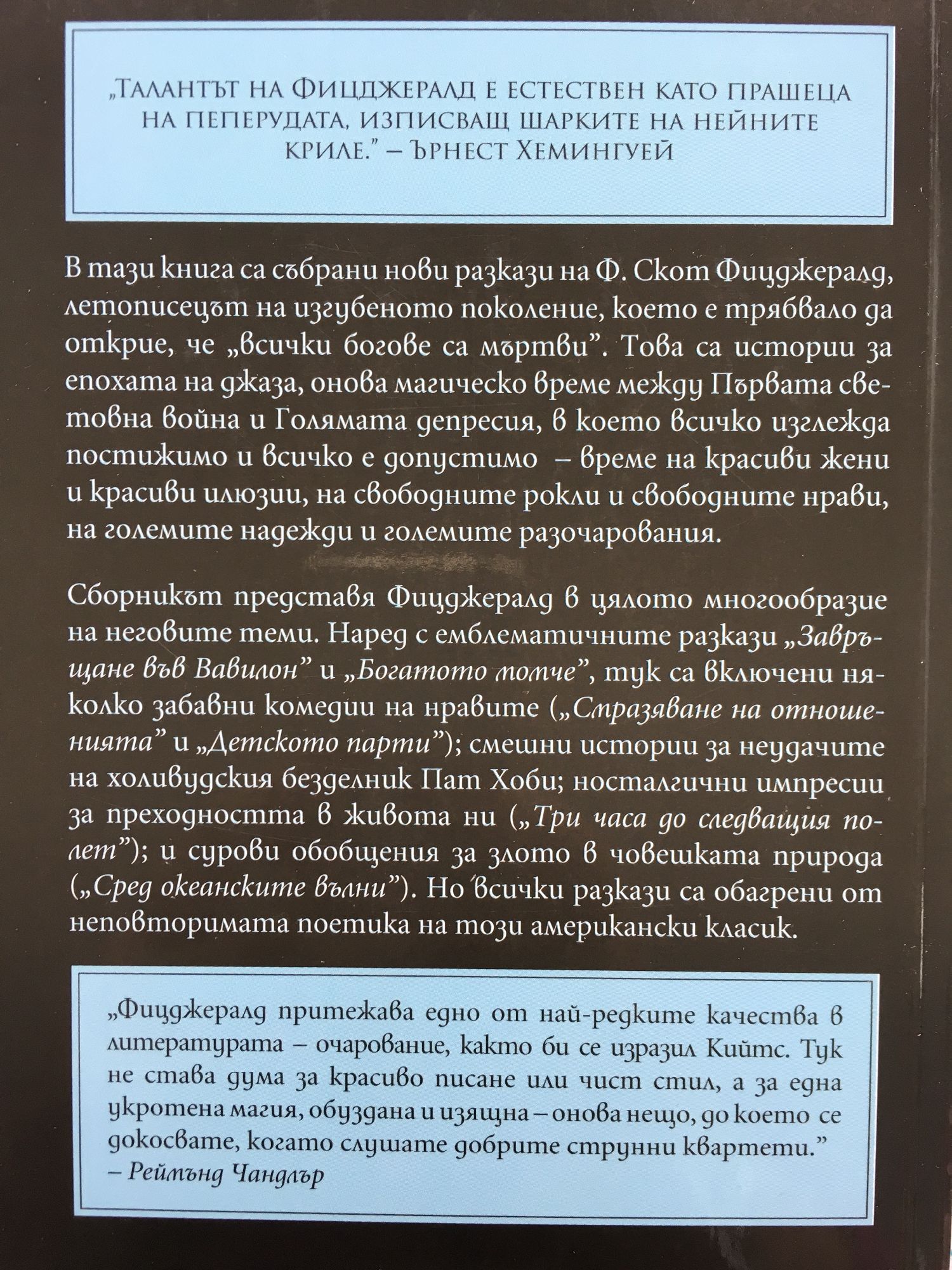 „Талантът на Фицджералд е естествен като прашеца на пеперудата, изписващ шарките на нейните криле.” – Ърнест Хемингуей В тази книга са събрани нови разкази на Ф. Скот Фицджералд, летописецът на изгубеното поколение, което е трябвало да открие, че „всички богове са мъртви”. Това са истории за епохата на джаза, онова магическо време между Първата световна война и Голямата депресия, в което всичко изглежда постижимо и всичко е допустимо – време на красиви жени и красиви илюзии, на свободните рокли и свободните нрави, на големите надежди и големите разочарования. Сборникът представя Фицджералд в цялото многообразие на неговите теми. Наред с емблематичните разкази „Завръщане във Вавилон” и „Богатото момче”, тук са включени няколко забавни комедии на нравите („Смразяване на отношенията” и „Детското парти”); смешни истории за неудачите на холивудския безделник Пат Хоби; носталгични импресии за преходността в живота ни („Три часа до следващия полет”); и сурови обобщения за злото в човешката природа („Сред океанските вълни”). Но всички разкази са обагрени от неповторимата поетика на този американски класик. „Фицджералд притежава едно от най-редките качества в литературата – очарование, както би се изразил Кийтс. Тук не става дума за красиво писане или чист стил, а за една укротена магия, обуздана и изящна – онова нещо, до което се докосвате, когато слушате добрите струнни квартети.” – Реймънд Чандлър