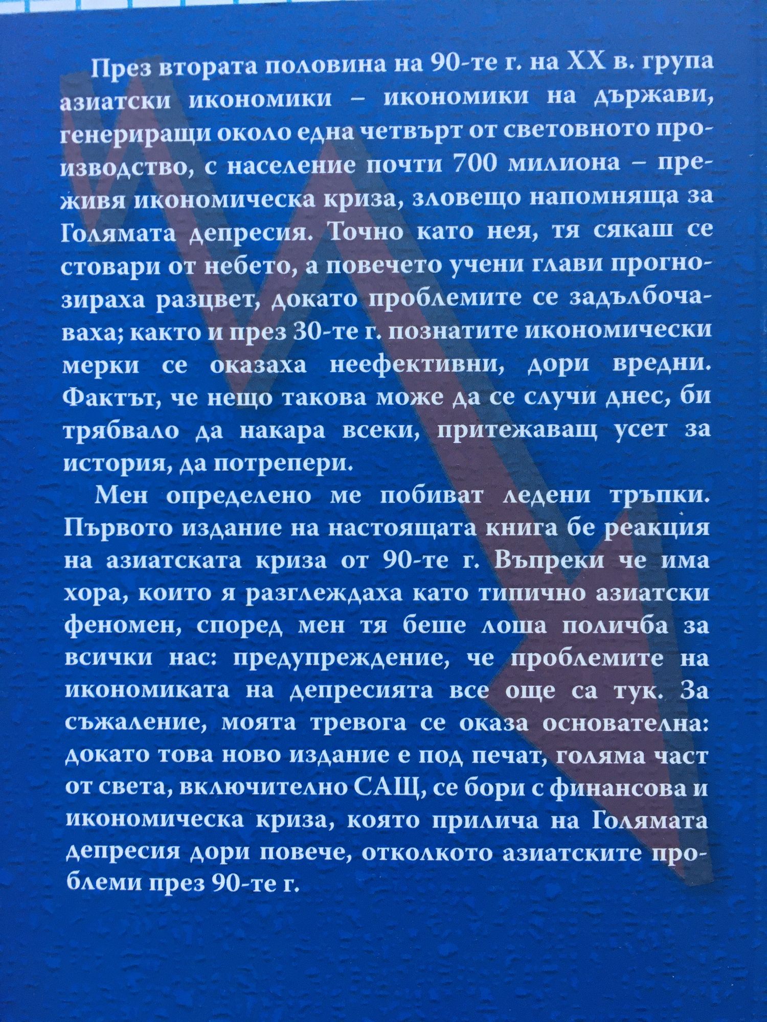 През втората половина на 90-те г. на XX в. група азиатски икономики - икономики на държави, генериращи около една четвърт от световното производство, с население почти 700 милиона - преживя икономическа криза, зловещо напомняща за Голямата депресия. Точно като нея, тя сякаш се стовари от небето, а повечето учени глави прогнозираха разцвет, докато проблемите се задълбочаваха; както и през 30-те г. познатите икономически мерки се оказаха неефективни, дори вредни. Фактът, че нещо такова може да се случи днес, би трябвало да накара всеки, притежаващ усет за история, да потрепери. Мен определено ме побиват ледени тръпки. Първото издание на настоящата книга бе реакция на азиатската криза от 90-те г. Въпреки че има хора, които я разглеждаха като типично азиатски феномен, според мен тя беше лоша поличба за всички нас: предупреждение, че проблемите на икономиката на депресията все още са тук. За съжаление, моята тревога се оказа основателна: докато това ново издание е под печат, голяма част от света, включително САЩ, се бори с финансова и икономическа криза, която прилича на Голямата депресия дори повече, отколкото азиатските проблеми през 90-те г.