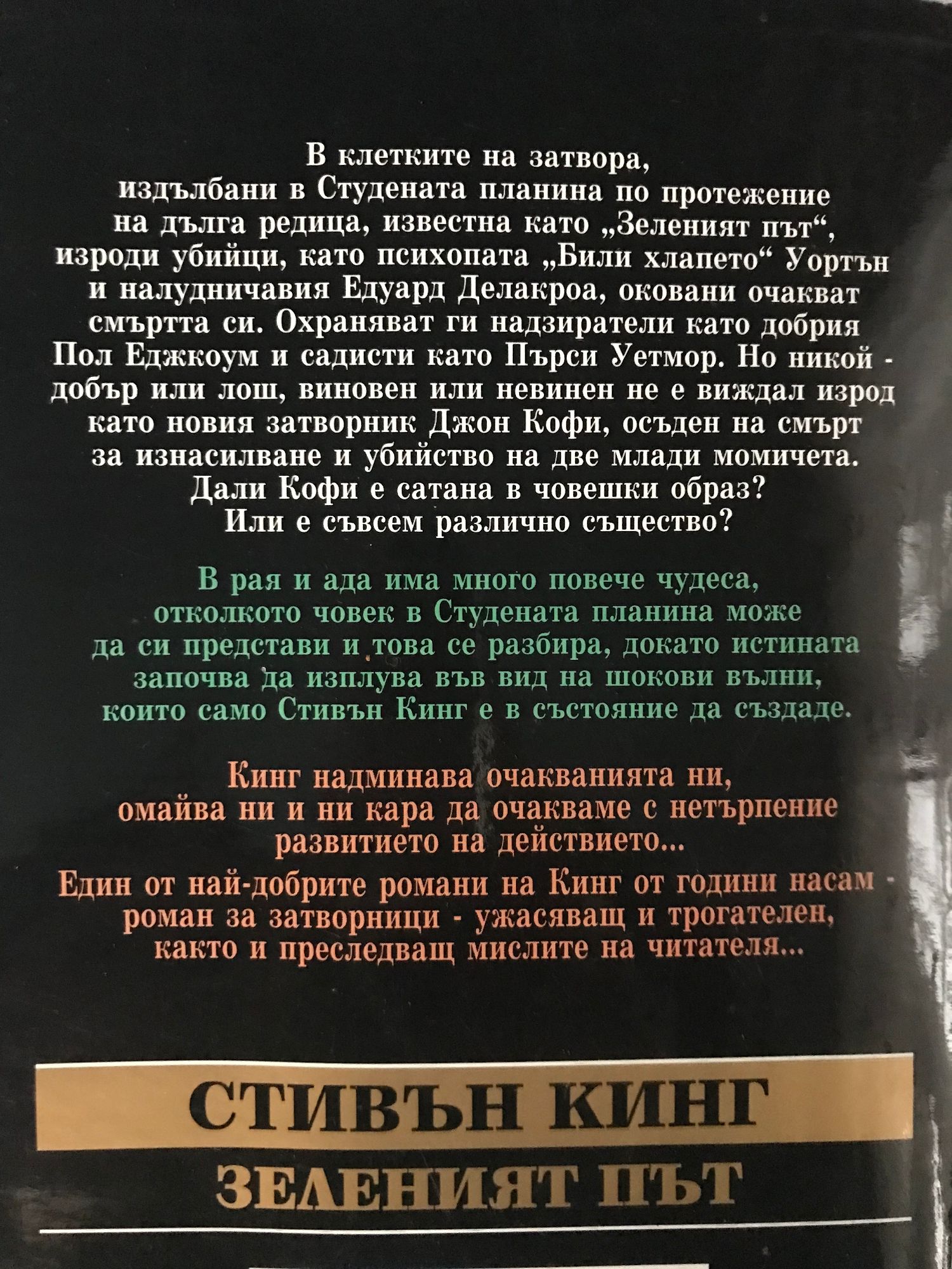В клетките на затвора, издълбани в Студената планина по протежение на дълга редица, известна като "Зеленият път", изроди убийци, като психопата "Били хлапето" Уортън и налудничавия Едуард Делакроа, оковани очакват смъртта си. Охраняват ги надзиратели като добрия Пол Еджкоум и садисти като Пърси Уетмор. Но никой добър или лош, виновен или невинен не е виждал изрод като новия затворник Джон Кофи, осъден на смърт за изнасилване и убийство на две млади момичета. Дали Кофи е сатана в човешки образ? Или е съвсем различно същество?.... В рая и ада има много повече чудеса, отколкото човек в Студената планина може да си представи и това се разбира, докато истината започва да изплува във вид на шокови вълни, които само Стовън Кинг е в състояние да създаде.