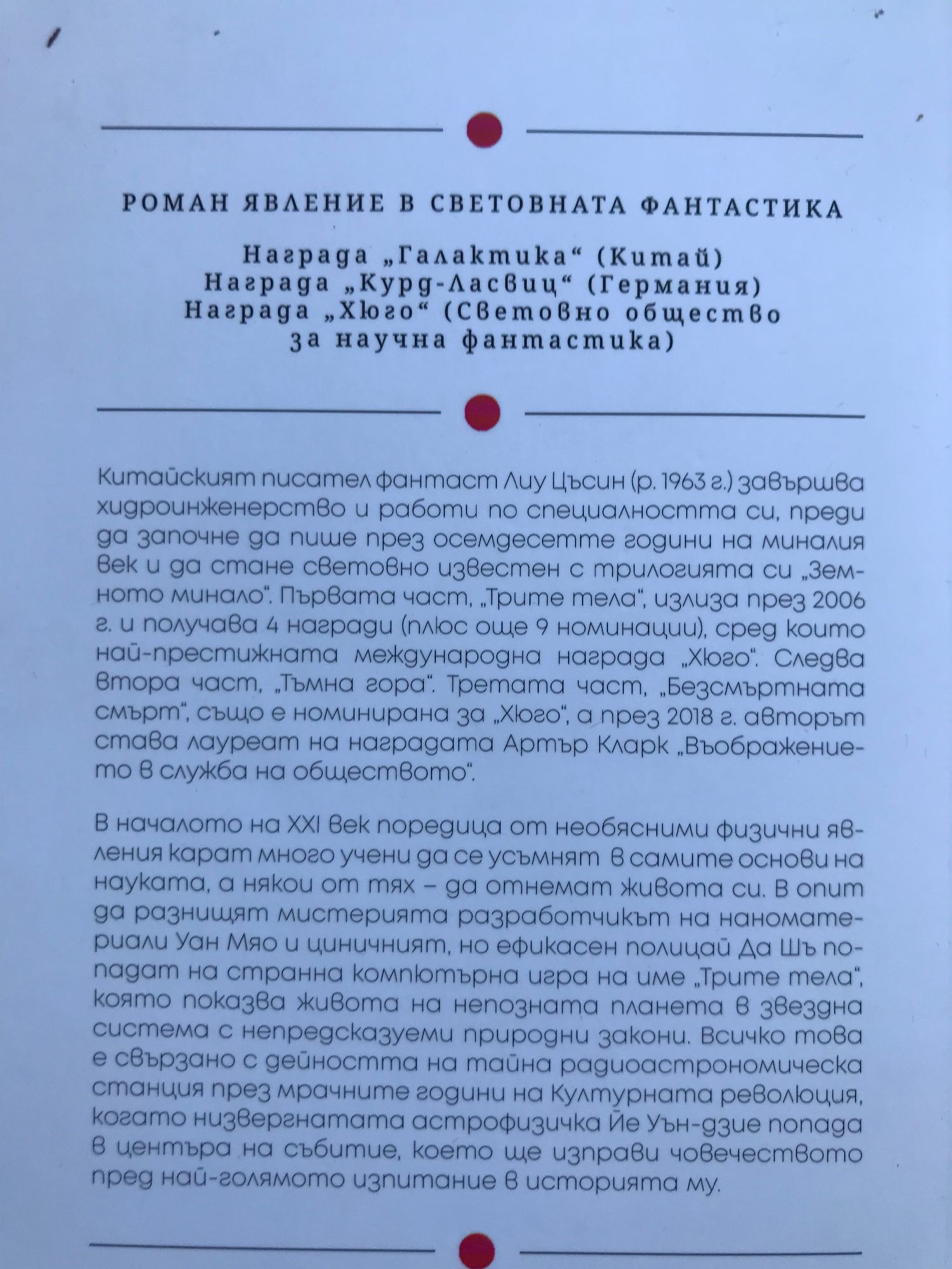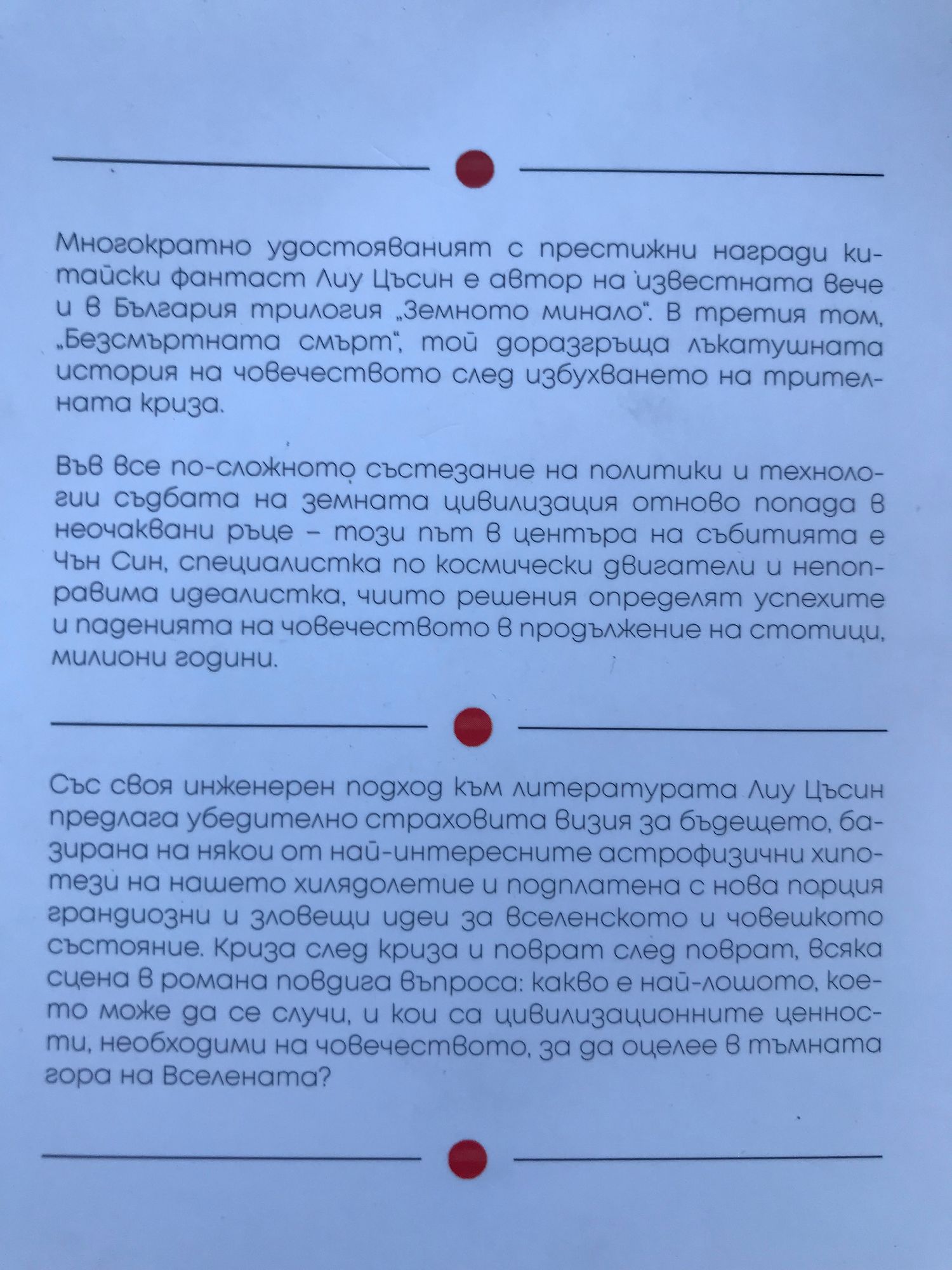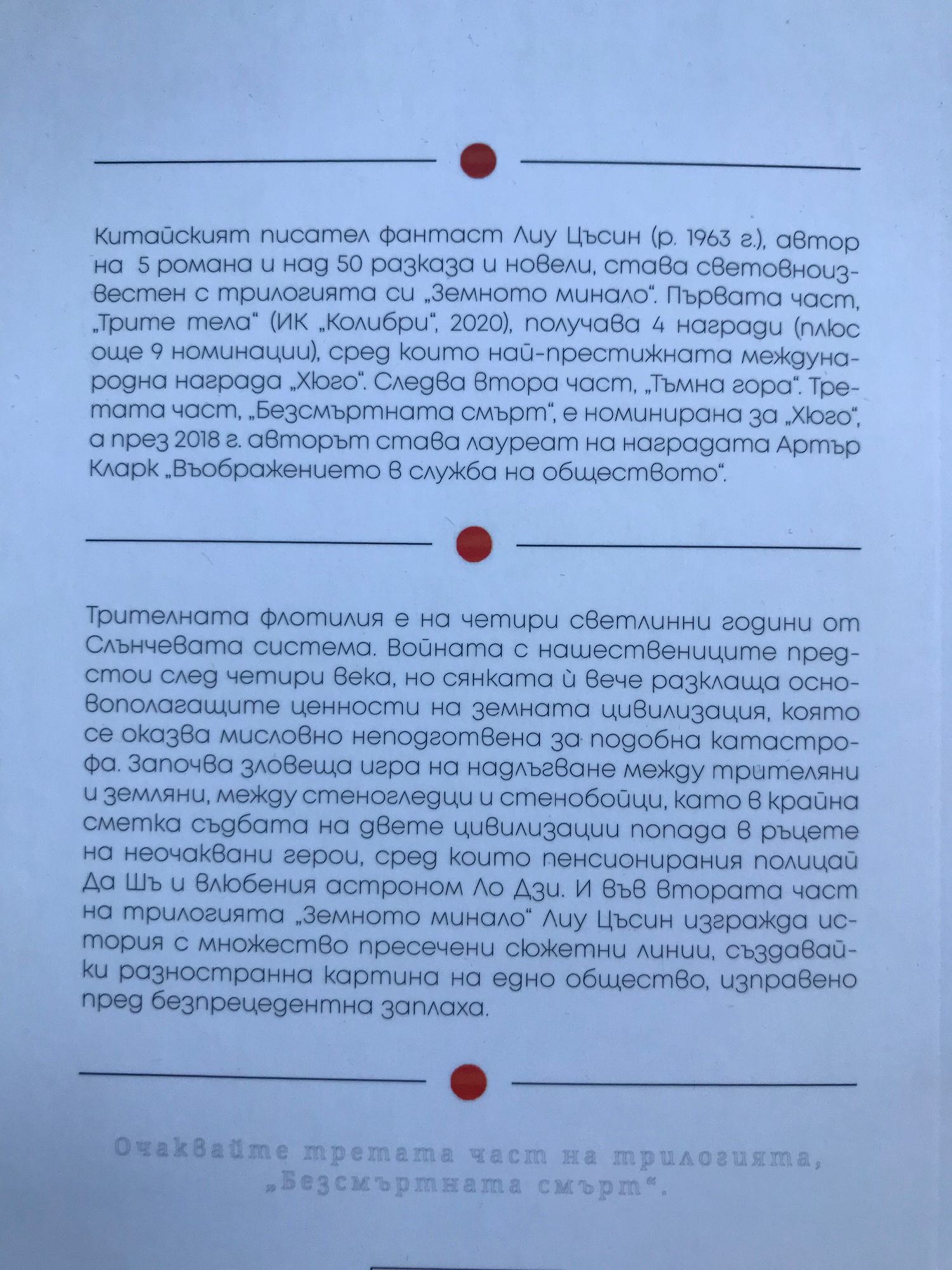 Част 1: Китайският писател фантаст Лиу Цъсин (р. 1963 г.) израства във времената на Културната революция, описвани от мнозина негови съвременници като „епоха без книги“, завършва хидроинженерство и работи по специалността си, преди да започне да пише през осемдесетте години на миналия век, повлиян от твърдата научна фантастика на Артър Кларк, но и от реализма на Лев Толстой. Рекордьор по получени награди „Галактика“, които отбелязват най-доброто в китайската фантастика, той придобива световна известност през 2015 г., когато става първият азиатски лауреат на „Хюго“, най-престижната награда за научнофантастична литература, присъдена му за първата част от трилогията „Земното минало“ – „Трите тела“. През 2018 г. е удостоен с наградата „Артър Кларк“ за въображение в служба на обществото. В началото на XXI век поредица от необясними физични явления карат много учени да се усъмнят в самите основи на науката, а някои от тях - да отнемат живота си. В опит да разнищят мистерията разработчикът на наноматериали Уан Мяо и циничният, но ефикасен полицай Да Шъ попадат на странна компютърна игра на име "Трите тела", която показва живота на непозната планета в звездна система с непредсказуеми природни закони. Всичко това е свързано с дейността на тайна радиоастрономическа станция през мрачните години на Културната революция, когато низвергнатата астрофизичка Йе Уън-дзие попада в центъра на събитие, което ще изправи човечеството пред най-голямото изпитание в историята му. Част 2: Трителната флотилия е на четири светлинни години от Слънчевата система. Войната с нашествениците предстои след четири века, но сянката ѝ вече разклаща основополагащите ценности на земната цивилизация, която се оказва мисловно неподготвена за подобна катастрофа. Започва зловеща игра на надлъгване между трителяни и земляни, между стеногледци и стенобойци, като в крайна сметка съдбата на двете цивилизации попада в ръцете на неочаквани герои, сред които пенсионирания полицай Да Шъ и влюбения астроном Ло Дзи. И във втората част на трилогията „Земното минало“ Лиу Цъсин изгражда история с множество пресечени сюжетни линии, създавайки разностранна картина на едно общество, изправено пред безпрецедентна заплаха. Част 3: Многократно удостояваният с престижни награди китайски фантаст Лиу Съцин е автор на известната вече и в България трилогия „Земното минало“. В третия том, „Безсмъртната смърт“, той доразгръща лъкатушната история на човечеството след избухването на трителната криза. Във все по-сложното състезание на политики и технологии съдбата на земната цивилизация отново попада в неочаквани ръце – този път в центъра на събитията е Чън Син, специалистка по космически двигатели и непоправима идеалистка, чиито решения определят успехите и паденията на човечеството в продължение на стотици, милиони години. Със своя инженерен подход към литературата Лиу Цъсин предлага убедително страховита визия за бъдещето, базирана на някои от най-интересните астрофизични хипотези на нашето хилядолетие и подплатена с нова порция грандиозни и зловещи идеи за вселенското и човешкото състояние. Криза след криза и поврат след поврат, всяка сцена в романа повдига въпроса: какво е най-лошото, което може да се случи, и кои са цивилизационните ценности, необходими на човечеството, за да оц