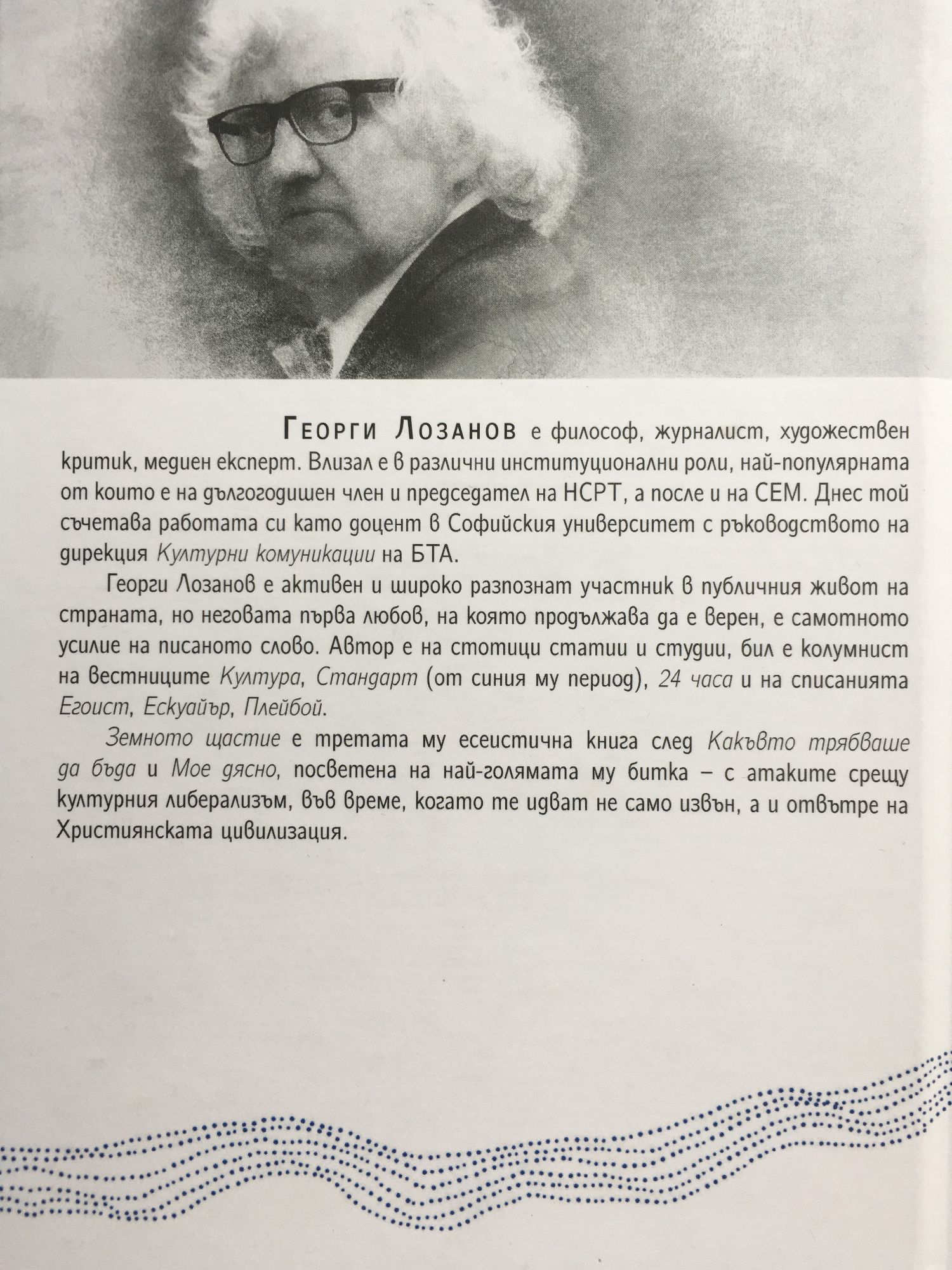 Георги Лозанов е философ, журналист, художествен критик, медиен експерт. Влизал е в различни институционални роли, най-популярната от които е на дългогодишен член и председател на НСРТ, а после и на СЕМ. Днес той съчетава работата си като доцент в Софийския университет с ръководството на дирекция Културни комуникации на БТА. "Земното щастие" е третата му есеистична книга след "Какъвто трябваше да бъда" и "Мое дясно", посветена на най-голямата му битка - с атаките срещу културния либерализъм, във време, когато те идват не само извън, а и отвътре на Християнската цивилизация.