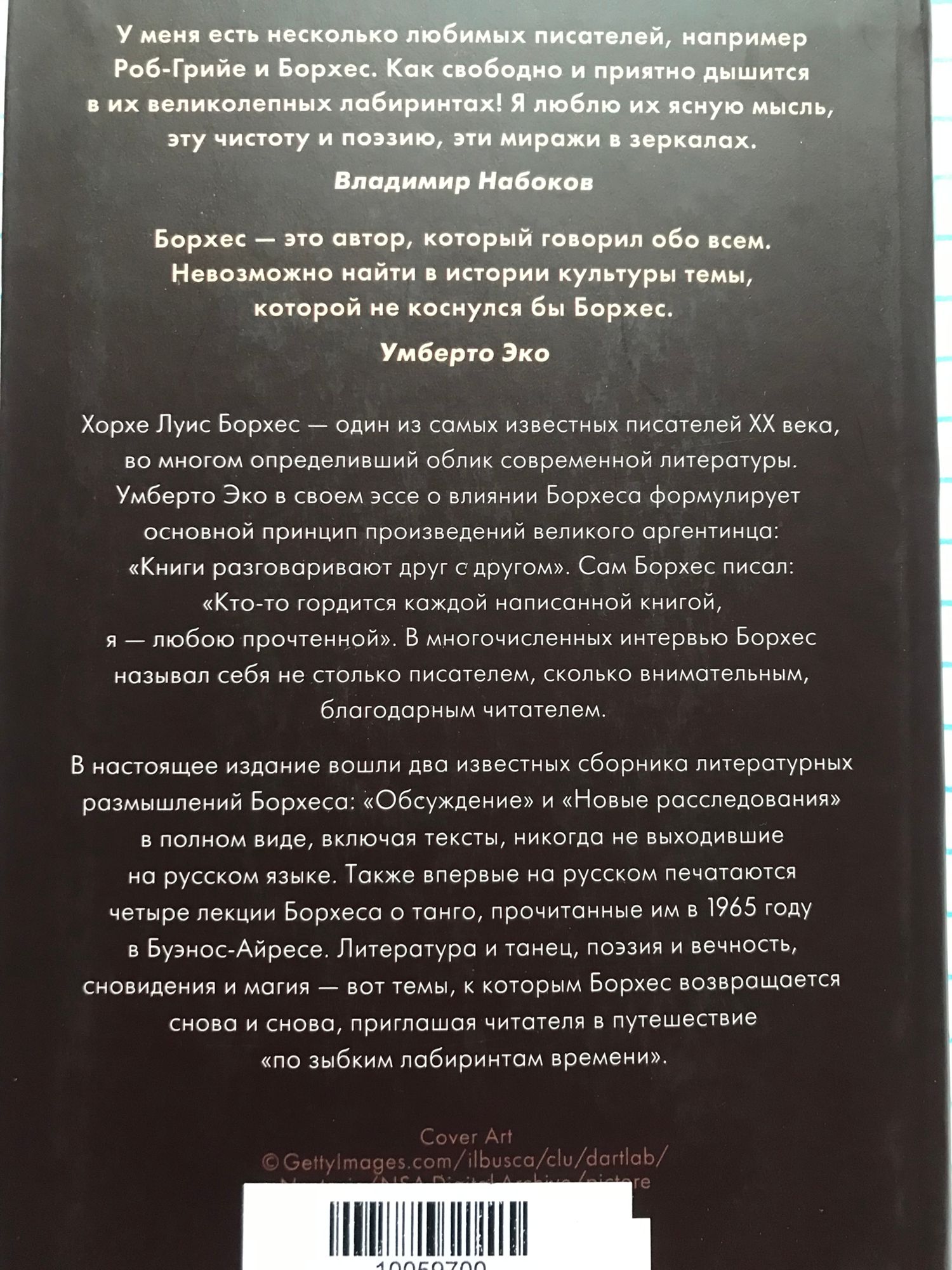 Хорхе Луис Борхес - один из самых известных писателей XX века, во многом определивший облик современной литературы. Умберто Эко в своем эссе о влиянии Борхеса формулирует основной принцип произведений великого аргентинца: "Книги разговаривают друг с другом". Сам Борхес писал: "Кто-то гордится каждой написанной книгой, я - любою прочтенной". В многочисленных интервью Борхес называл себя не столько писателем, сколько внимательным, благодарным читателем. В настоящее издание вошли два известных сборника литературных размышлений Борхеса: "Обсуждение" и "Новые расследования" в полном виде, а также четыре лекции Борхеса о танго, прочитанные им в 1965 году в Буэнос-Айресе. Литература и танец, поэзия и вечность, сновидения и магия - вот темы, к которым Борхес возвращается снова и снова, приглашая читателя в путешествие "по зыбким лабиринтам времени".