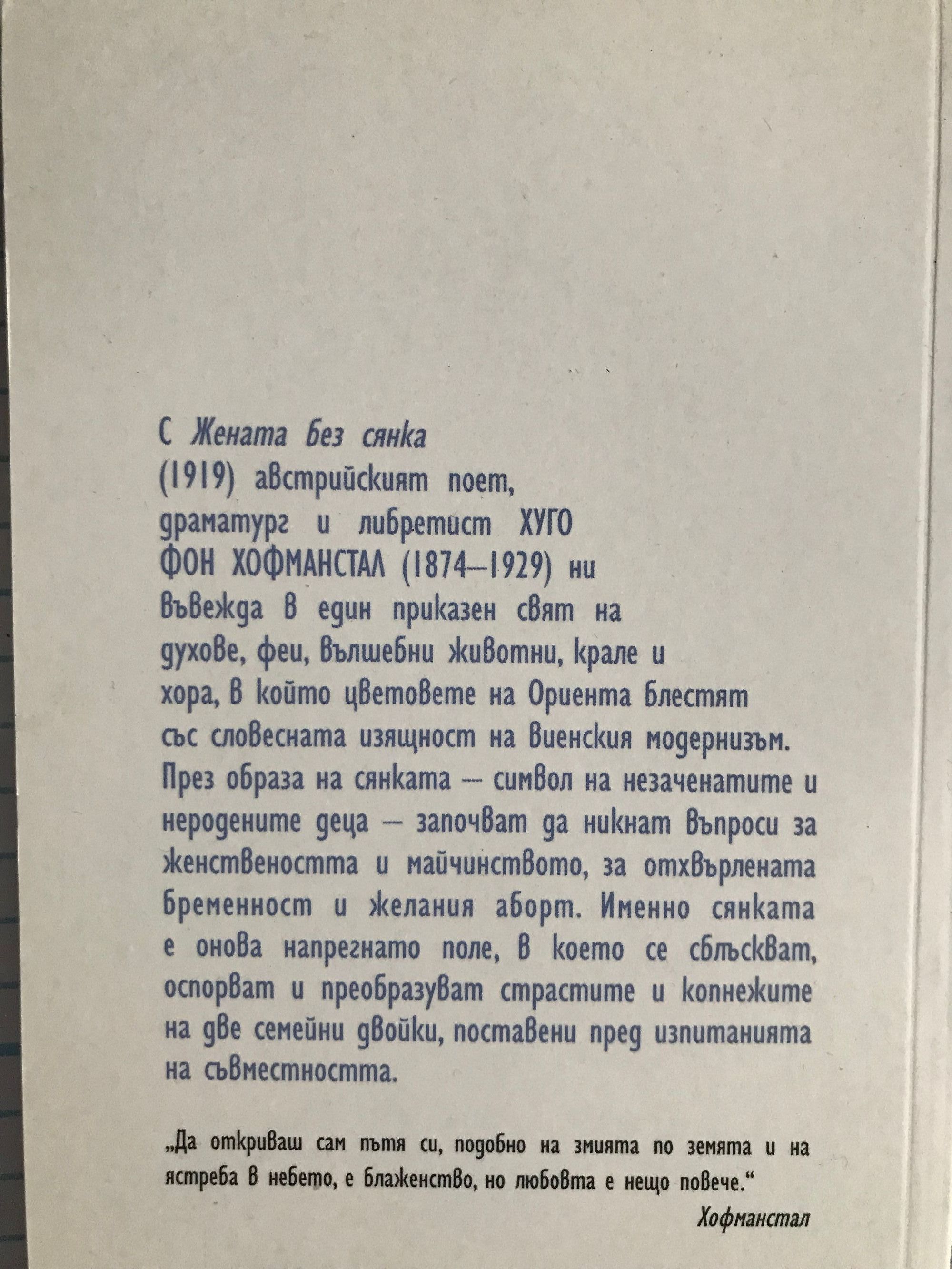 С "Жената без сянка" /1919/ австийският поет, драматург и либретист Хуго фон Хофманстал /1874-1929/ ни въвежда в един приказен свят на духове, феи, вълшебни животни, крале и хора, в който цветовете на Ориента блестят със словесната изящност на виенския модернизъм. През образа на сянката - символ на незаченатите и неродените деца - започват да никнат въпроси за женствеността и майчинството, за отхвърлената бременност и желания аборт. Именно сянката е онова напрегнато поле, в което се сблъскват, оспорват и преобразуват страстите и копнежите на две семейни двойки, поставени пред изпитанията на съвместимостта.