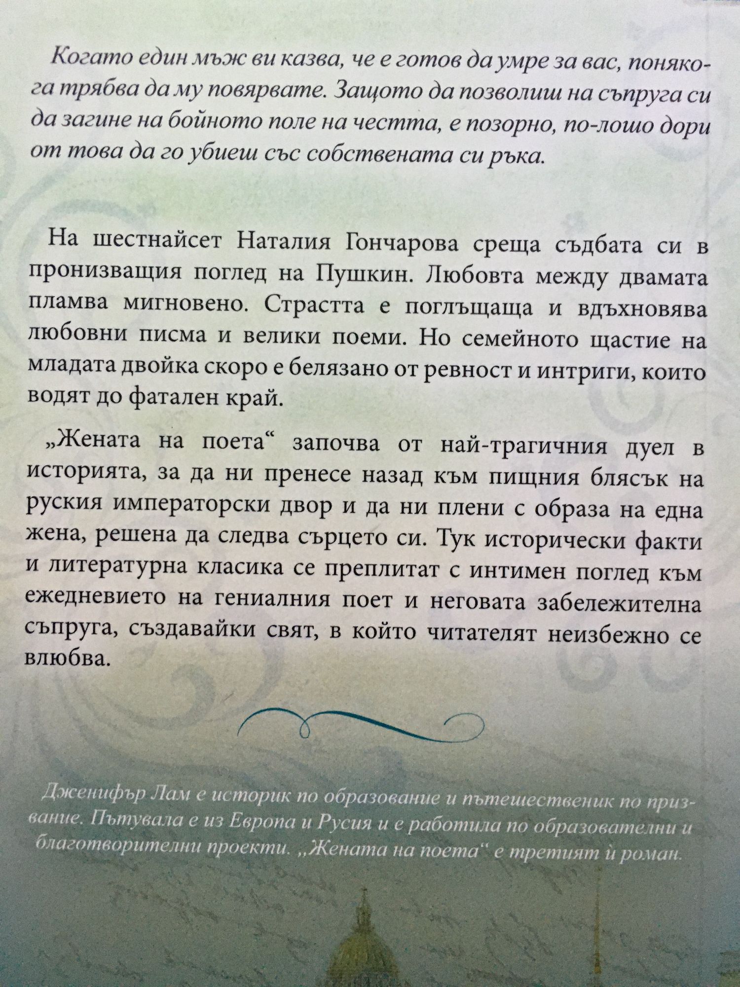Когато един мъж ви казва, че е готов да умре за вас, понякога трябва да му повярвате. Защото да позволиш на съпруга си да загине на бойното поле на честта, е позорно, по-лошо дори от това да го убиеш със собствената си ръка. На шестнайсет Наталия Гончарова среща съдбата си в пронизващия поглед на Пушкин. Любовта между двамата пламва мигновено. Страстта е поглъщаща и вдъхновява любовни писма и велики поеми. Но семейното щастие на младата двойка скоро е белязано от ревност и интриги, които водят до фатален край. „Жената на поета“ започва от най-трагичния дуел в историята, за да ни пренесе назад към пищния блясък на руския императорски двор и да ни плени с образа на една жена, решена да следва сърцето си. Тук исторически факти и литературна класика се преплитат с интимен поглед към ежедневието на гениалния поет и неговата забележителна съпруга, създавайки свят, в който читателят неизбежно се влюбва.