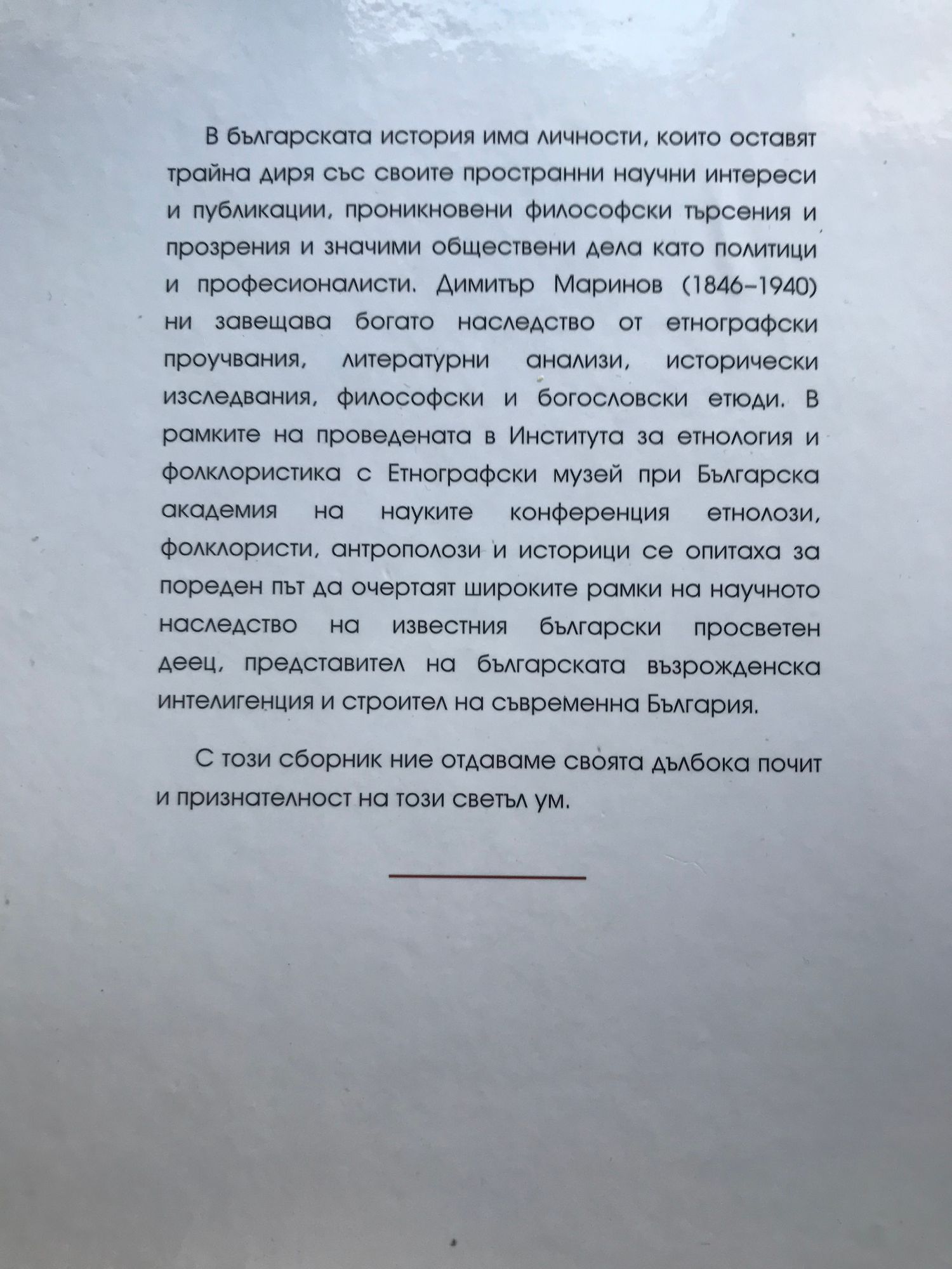 В българската история има личности, които оставят трайна диря със своите пространни научни интереси и публикации, проникновени философски търсения и прозрения и значими обществени дела като политици и професионалисти. Димитър Маринов (1846-1940) ни завещава богато наследство от етнографски проучвания, литературни анализи, исторически изследвания, философски и богословски етюди. В рамките на проведената в Института за етнология и фолклористика с Етнографски музей при Българска академия на науките конференция етнолози, фолклористи, антрополози и историци се опитаха за пореден път да очертаят широките рамки на научното наследство на известния български просветен деец, представител на българската възрожденска интелигенция и строител на съвременна България. С този сборник ние отдаваме своята дълбока почит и признателност на този светъл ум.