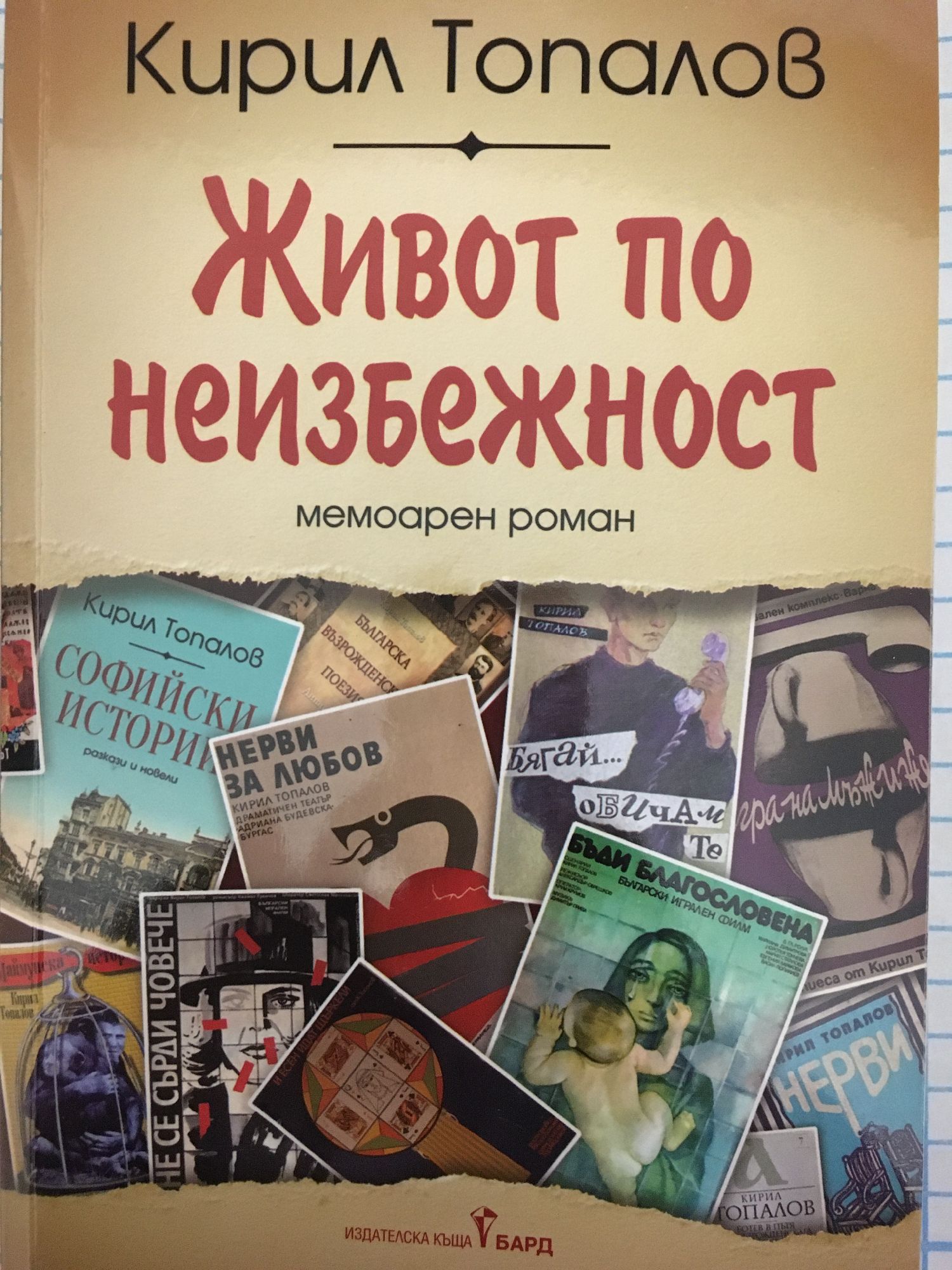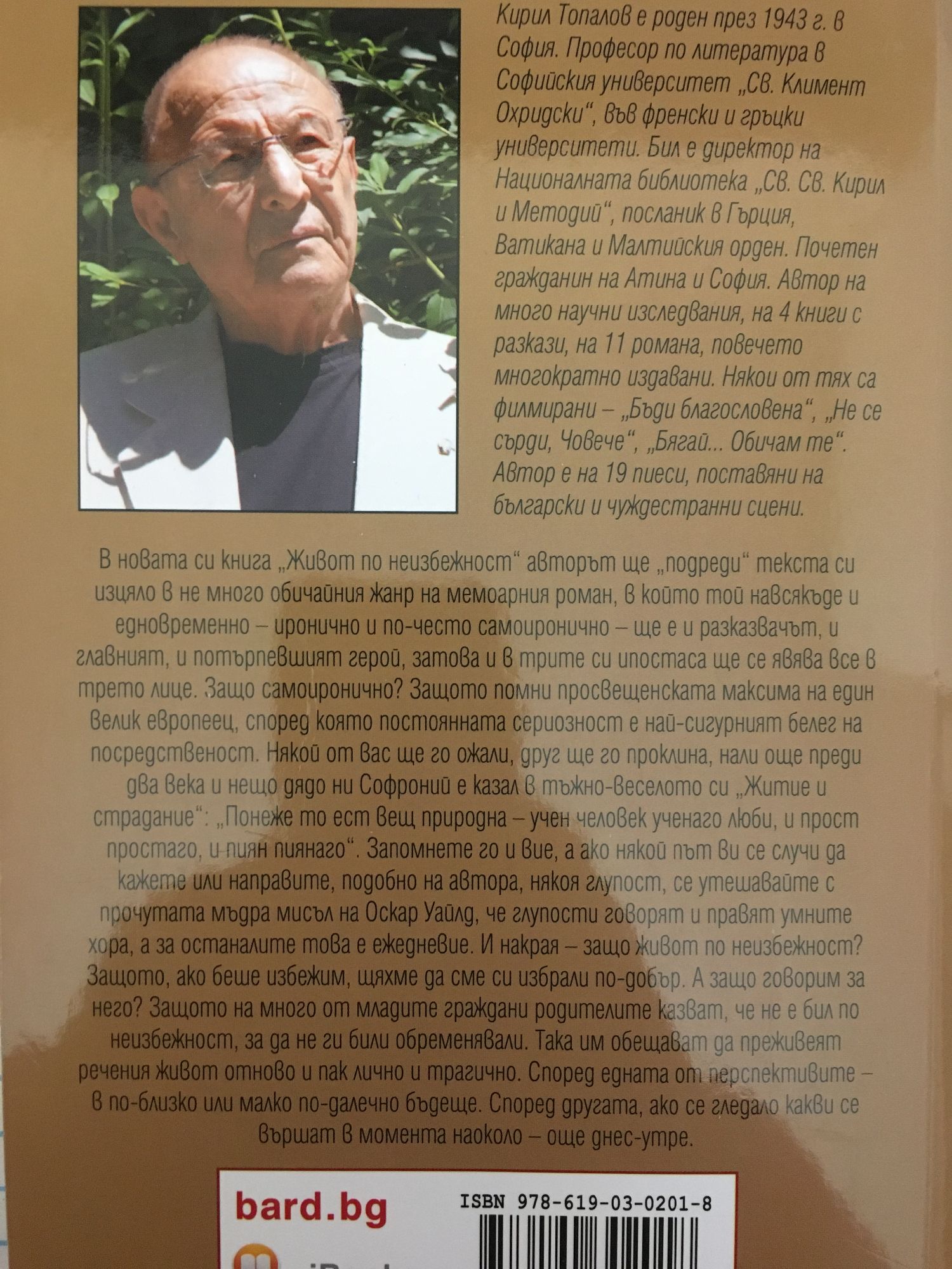 В новата си книга „Живот по неизбежност“ авторът ще „подреди“ текста си изцяло в не много обичайния жанр на мемоарния роман, в който той навсякъде и едновременно – иронично и по-често самоиронично – ще е и разказвачът, и главният, и потърпевшият герой, затова и в трите си ипостаса ще се явява все в трето лице. Защо самоиронично? Защото помни просвещенската максима на един велик европеец, според която постоянната сериозност е най-сигурният белег на посредственост. Някой от вас ще го ожали, друг ще го проклина, нали още преди два века и нещо дядо ни Софроний е казал в тъжно-веселото си „Житие и страдание“: „Понеже то ест вещ природна – учен человек ученаго люби, и прост простаго, и пиян пиянаго“. Запомнете го и вие, а ако някой път ви се случи да кажете или направите подобно на автора някоя глупост, се утешавайте с прочутата мъдра мисъл на Оскар Уайлд, че глупости говорят и правят умните хора, а за останалите това е ежедневие. И накрая – защо живот по неизбежност? Защото ако беше избежим, щяхме да сме си избрали по-добър. А защо говорим за него? Защото на много от младите граждани родителите казват, че не е бил по неизбежност, за да не ги били обременявали. Така им обещават да преживеят речения живот отново и пак лично и трагично. Според едната от перспективите – в по-близко или малко по-далечно бъдеще. Според другата, ако се гледало какви се вършат в момента наоколо – още днес-утре. Кирил Топалов е роден през 1943 г. в София. Професор по литература в Софийския университет „Св. Климент Охридски“, във френски и гръцки университети. Бил е директор на Националната библиотека „Св. Св. Кирил и Методий“, посланик в Гърция, Ватикана и Малтийския орден. Почетен гражданин на Атина и София. Автор на много научни изследвания, на 4 книги с разкази, на 11 романа, повечето многократно издавани. Някои от тях са филмирани – „Бъди благословена“, „Не се сърди, Човече“, „Бягай... Обичам те“. Автор е на 19 пиеси, поставяни на български и чуждестранни сцени.