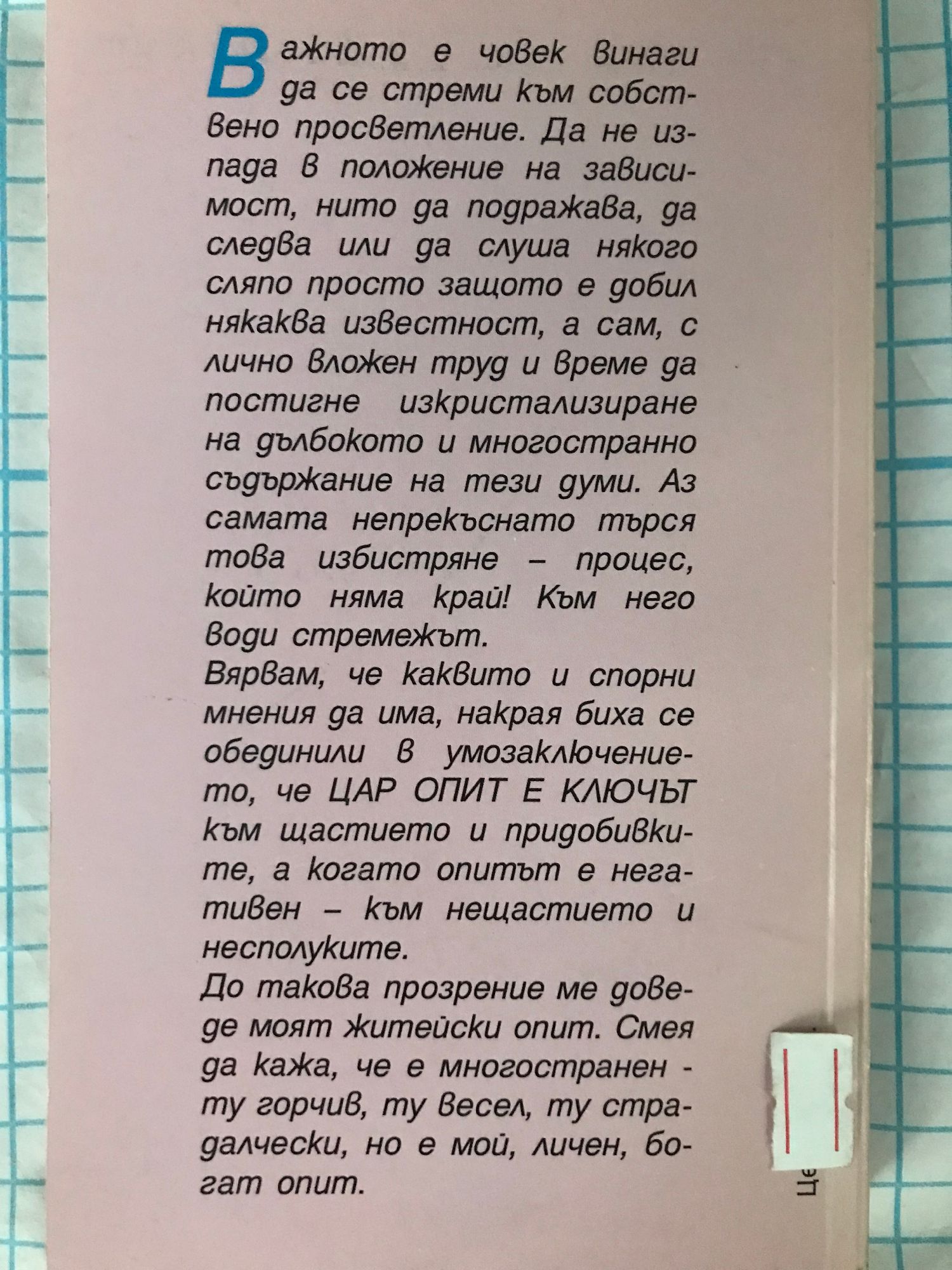 Важно е човек винаги да се стреми към собствено просветление. Да не изпада в положение на зависимост, нито да подражава, да следва или да слуша някого сляпо просто защото е добил някаква известност, а сам, с лично вложен труд и време да постигне изкристализиране на дълбокото и многостранно съдържание на тези думи. Аз самата непрекъснато търся това избистряне - процес, който няма край! Към него води стремежът.