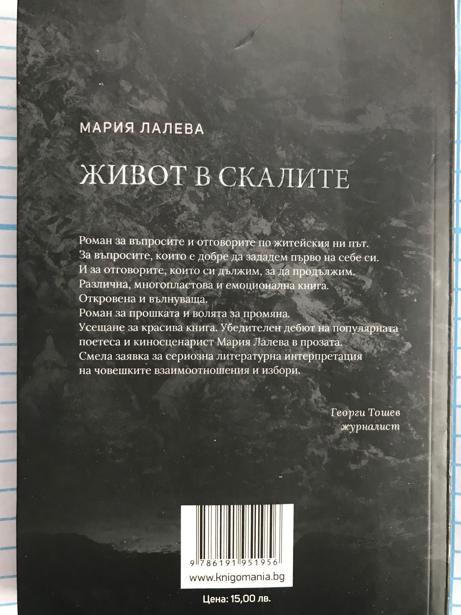 "Роман за въпросите и отговорите по житейския ни път. За въпросите, които е добре да зададем първо на себе си. И за отговорите, които си дължим, за да продължим. Различна, многопластова и емоционална книга. Откровена и вълнуваща. Роман за прошката и волята за промяна. Усещане за красива книга. Убедителен дебют на популярната поетеса и киносценарист Мария Лалева в прозата. Смела заявка за сериозна литературна интерпретация на човешките взаимоотношения и избори."