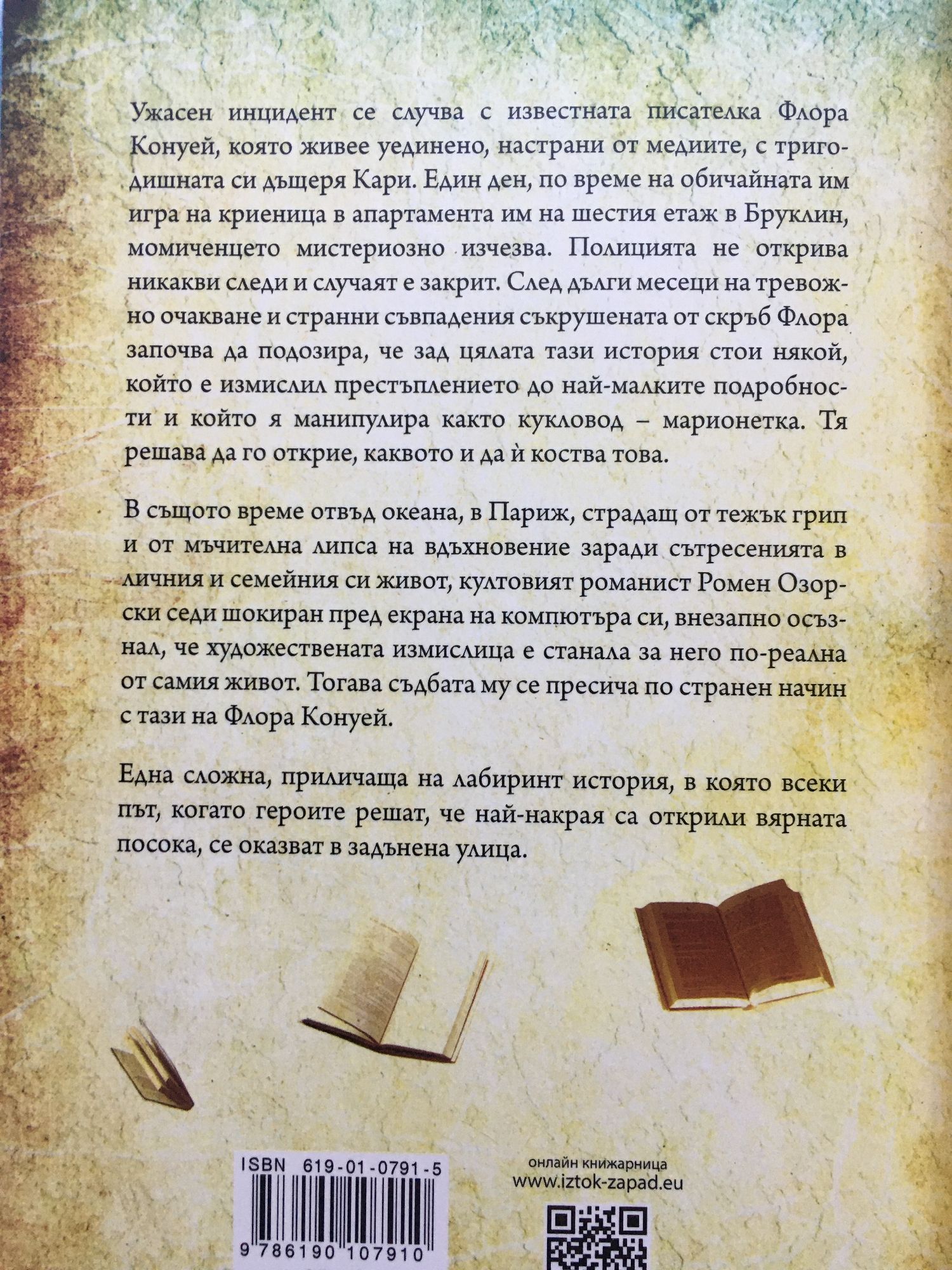 Ужасен инцидент се случва с известната писателка Флора Конуей, която живее уединено, настрани от медиите, с тригодишната си дъщеря Кари. Един ден, по време на обичайната им игра на криеница в апартамента им на шестия етаж в Бруклин, момиченцето мистериозно изчезва. Полицията не открива никакви следи и случаят е закрит. След дълги месеци на тревожно очакване и странни съвпадения съкрушената от скръб Флора започва да подозира, че зад цялата тази история стои някой, който е измислил престъплението до най-малките подробности и който я манипулира както кукловод – марионетка. Тя решава да го открие, каквото и да ? коства това. В същото време отвъд океана, в Париж, страдащ от тежък грип и от мъчителна липса на вдъхновение заради сътресенията в личния и семейния си живот, култовият романист Ромен Озорски седи шокиран пред екрана на компютъра си, внезапно осъзнал, че художествената измислица е станала за него по-реална от самия живот. Тогава съдбата му се пресича по странен начин с тази на Флора Конуей. Една сложна, приличаща на лабиринт история, в която всеки път, когато героите решат, че най-накрая са открили вярната посока, се оказват в задънена улица.