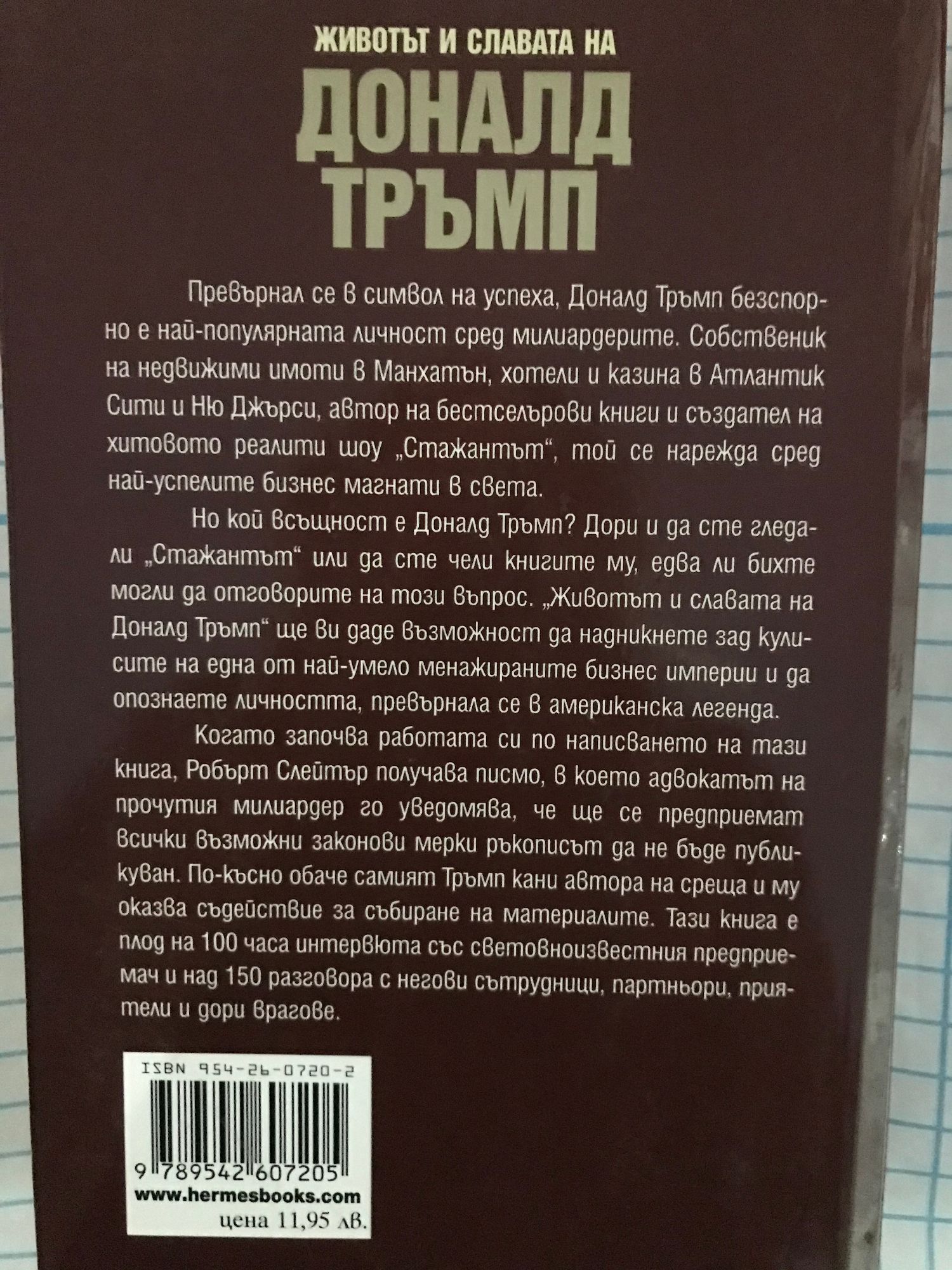 Превърнал се в символ на успеха, Доналд Тръмп безспорно е най-популярната личност сред милиардерите. Собственик на недвижими имоти в Манхатън, хотели и казина в Атлантик Сити и Ню Джърси, автор на бестселърови книги и създател на хитовото реалити шоу „Стажантът”, той се нарежда сред най-успелите бизнес магнати в света. Но кой всъщност е Доналд Тръмп? Дори и да сте гледали „Стажантът” или да сте чели книгите му, едва ли бихте могли да отговорите на този въпрос. „Животът и славата на Доналд Тръмп” ще ви даде възможност да надникнете зад кулисите на една от най-умело менажираните бизнес империи и да опознаете личността, превърнала се в американска легенда. Когато започва работата си по написването на тази книга, Робърт Слейтър получава писмо, в което адвокатът на прочутия милиардер го уведомява, че ще се предприемат всички възможни законови мерки ръкописът да не бъде публикуван. По-късно обаче самият Тръмп кани автора на среща и му оказва съдействие за събиране на материалите. Тази книга е плод на 100 часа интервюта със световноизвестния предприемач и над 150 разговори с негови сътрудници, партньори, приятели и дори врагове.