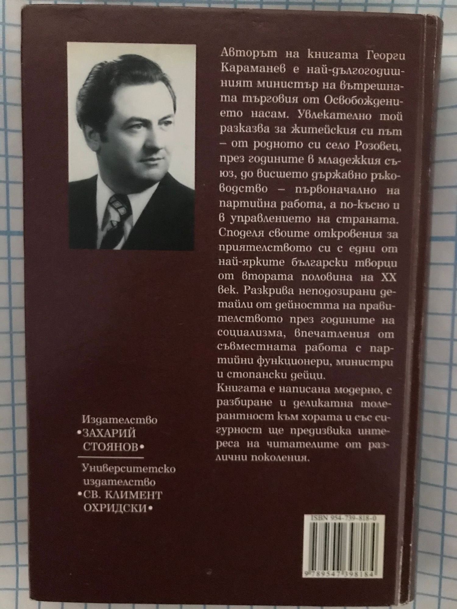 Авторът на книгата Георги Караманев е най-дългогодишният министър на Вътрешната търговия от Освобождението насам. Увлекателно той разказва за житейския си път - от родното си село Розовец, през годините в младежкия съюз, до Висшето държавно ръководство - първоначално на партийна работа, а по-късно и в управлението на страната. Споделя своите откровения за приятелството си с едни от най-ярките български творци от Втората половина на XX век. Разкрива неподозирани детайли от дейността на правителството през годините на социализма, впечатления от съвместната работа с партийни функционери, министри и стопански дейци. Книгата е написана модерно, с разбиране и деликатна толерантност към хората и със сигурност ще предизвика интереса на читателите от различни поколения.