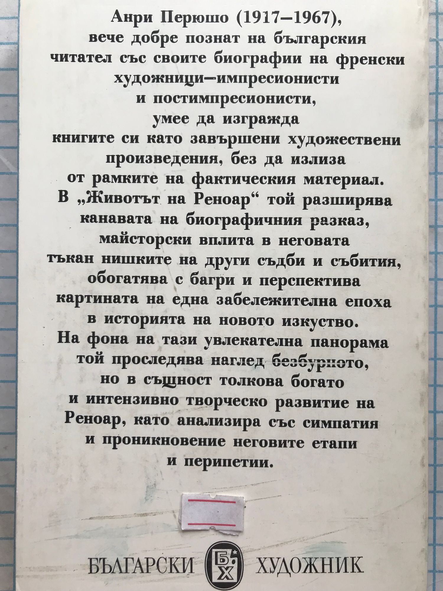 Анри Перюшо (1917–1967), вече добре познат на българския читател със своите биографии на френски художници — импресионисти и постимпресионисти, умее да изгражда книгите си като завършени художествени произведения, без да излиза от рамките на фактическия материал. В „Животът на Реноар“ той разширява канавата на биографичния разказ, майсторски вплита в неговата тъкан нишките на други съдби и събития, обогатява с багри и перспектива картината на една забележителна епоха в историята на новото изкуство. На фона на тази увлекателна панорама той проследява наглед безбурното, но в същност толкова богато и интензивно творческо развитие на Реноар, като анализира със симпатия и проникновение неговите етапи и перипетии.