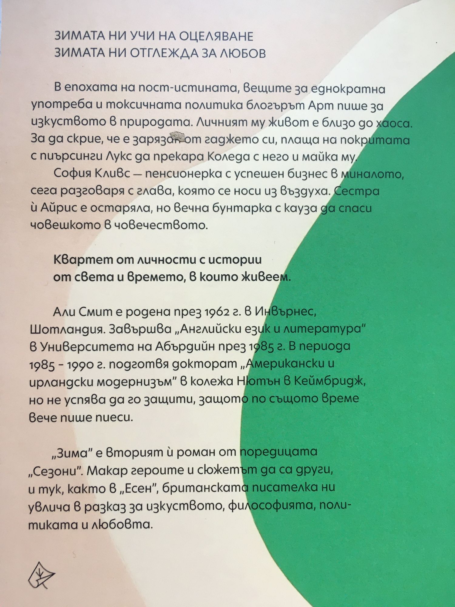 Али Смит е родена през 1962 г. в Инвърнес, Шотландия. Завършва Английски език и литература в Университета на Абърдийн през 1985 г. В периода 1985-1990 подготвя докторат по Американски и Ирландски модернизъм в колежа Нютън в Кембридж, но не успява да го защити, защото по същото време вече пише пиеси. „Зима” е вторият й роман от поредицата „Сезони”. Макар героите и сюжетът да са други, и тук, както в „Есен”, британската писателка ни увлича в разказ за изкуството, философията, политиката и любовта. Зимата ни учи на оцеляване. Зимата ни отглежда за любов. В епохата на пост-истината, вещите за еднократна употреба и токсичната политика блогърът Арт пише за Изкуството в природата. Личният му живот е близо до хаоса. За да скрие, че е зарязан от гаджето си, плаща на покритата с пиърсинги Лукс да прекара Коледа с него и майка му. София Кливс – пенсионерка с успешен бизнес в миналото, сега разговаря с глава, която се превръща в камък. Сестра й Айрис е остаряла, но вечна бунтарка с кауза да спаси човешкото в човечеството. Квартет от личности с истории от света и времето, в които живеем.